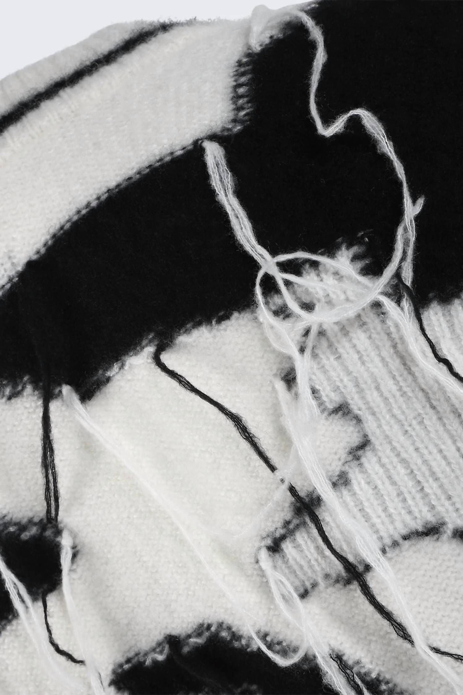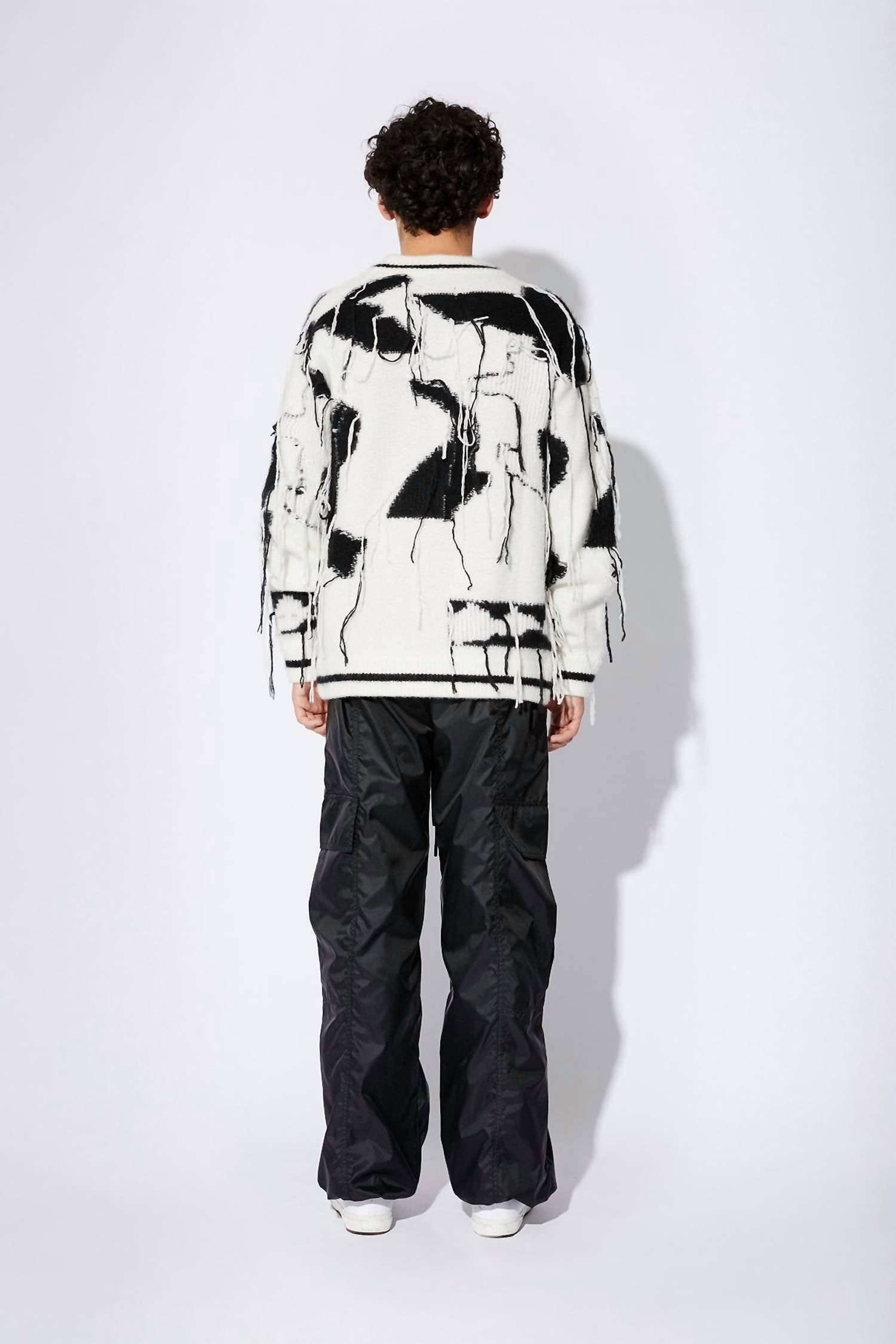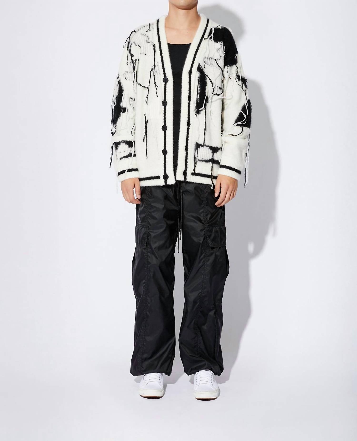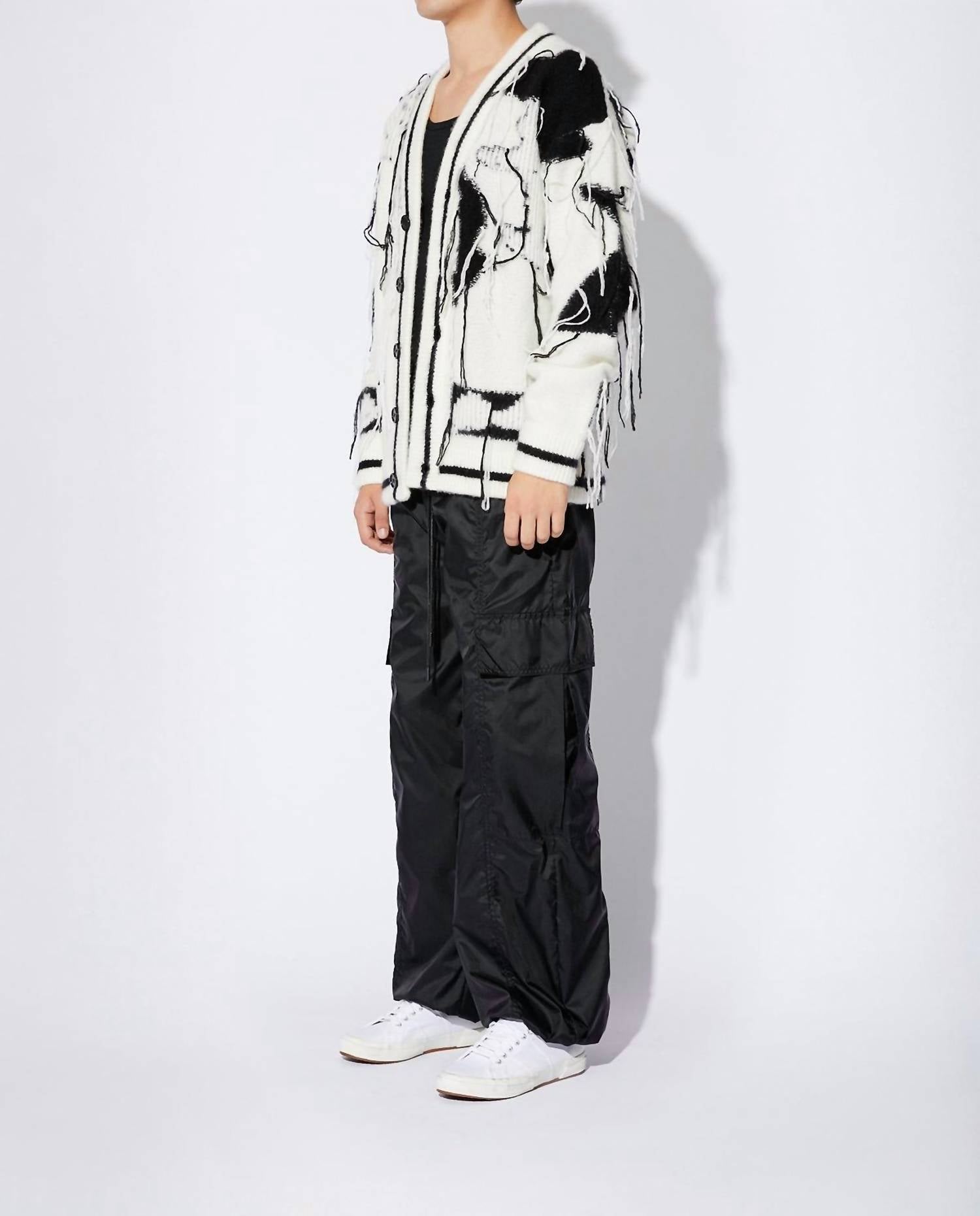 Introducing the Zephyr Sweater by RtA, a refined black abstract cardigan perfect for spring travels. This men's patterned cardigan, crafted from a luxurious 75% Cashmere and 25% Silk blend, features long sleeves and a sophisticated V-neckline. It is designed with a button closure and boasts an oversized fit, offering both comfort and style. Made in the PRC, this piece requires dry cleaning to maintain its quality. Model is 6'2" and wears a size S.