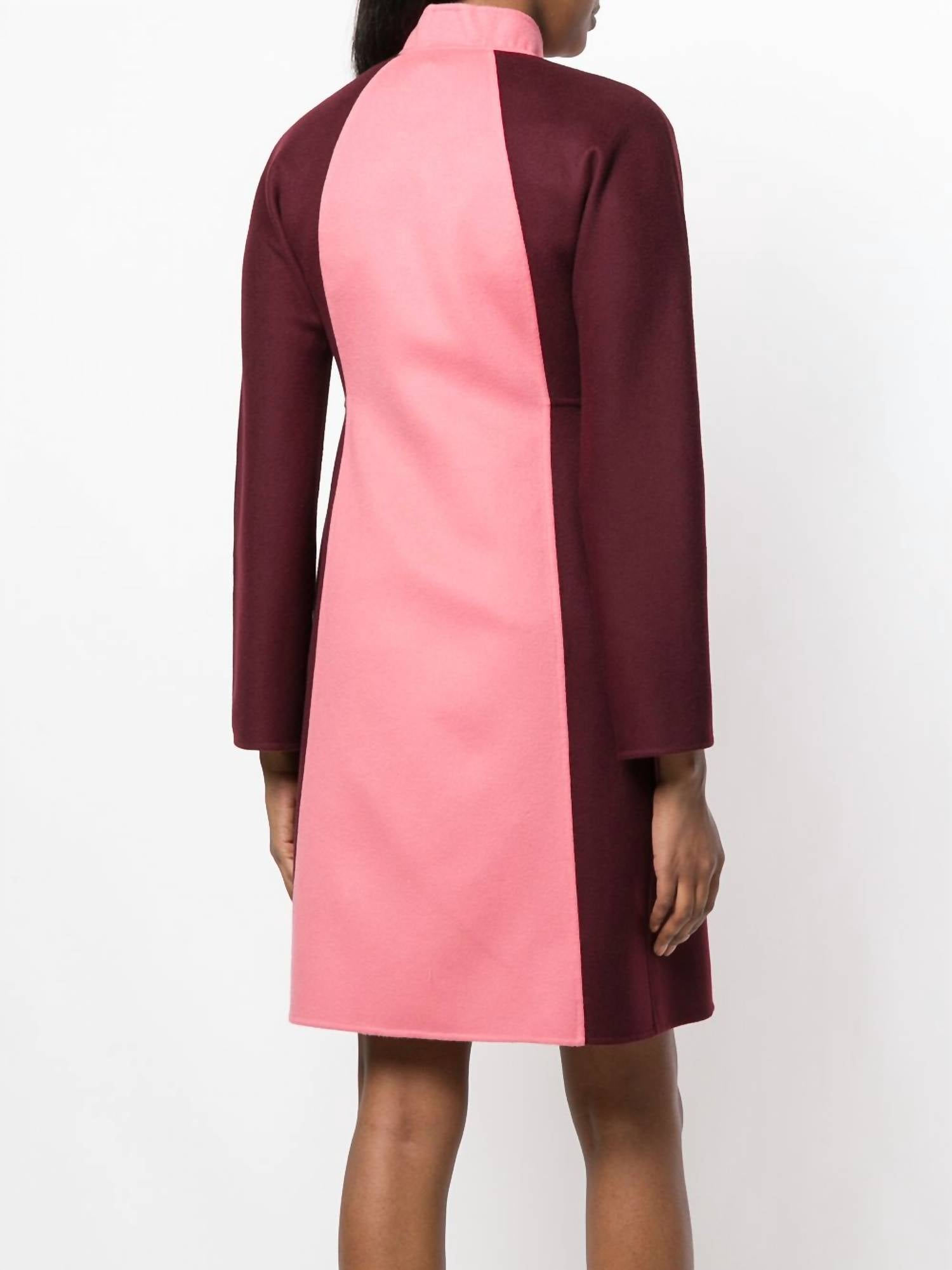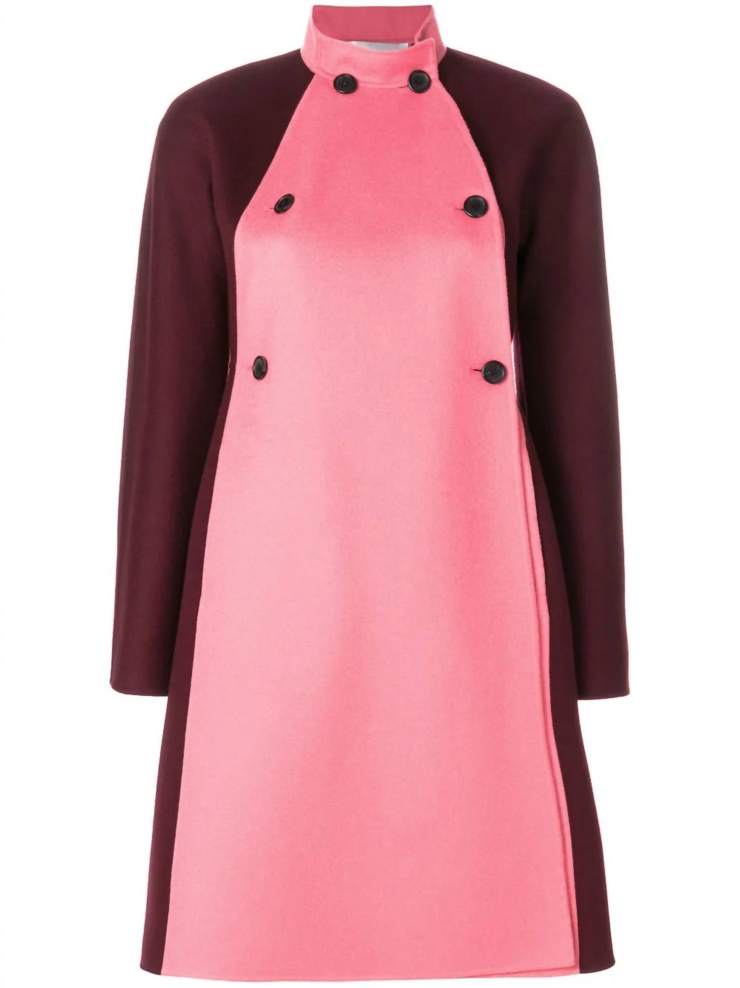 Just the right amound of preppy and polished. The Valentino Wool and Cashmere Blend Coat in an elegant pink and burgundy two-tone design is perfect for the fall season. This women's coat features long sleeves and a high mockneck for a striking silhouette. With its double-breasted button closure, this solid wool blend pea coat exudes sophistication despite lacking pockets. To preserve its luxury feel, dry clean only.