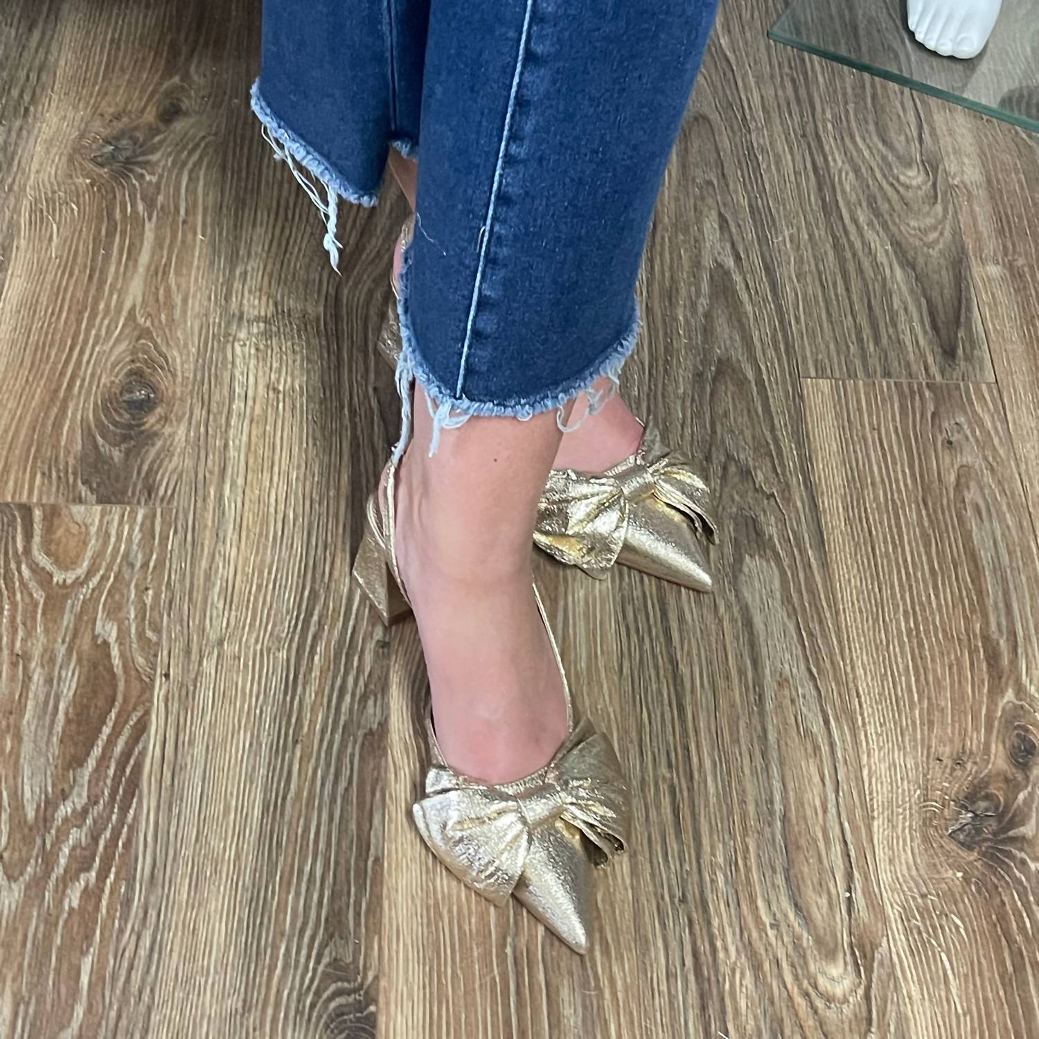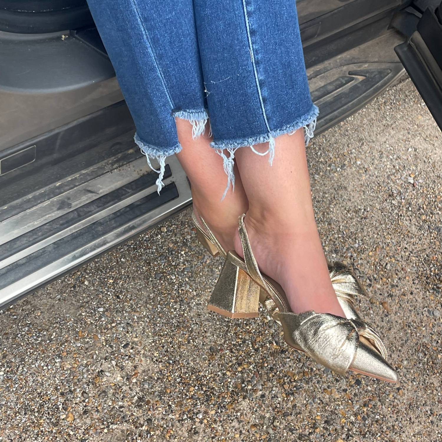 The perfect height for day to night. Elevate your festive look with these elegant slingback heels, crafted from luxurious gold cashmere. Featuring a pointed toe and a striking bow, they offer a comfortable 3" block heel for all-day wear. Perfect for adding sophistication to any holiday ensemble, these narrow-fit shoes are a stylish must-have.