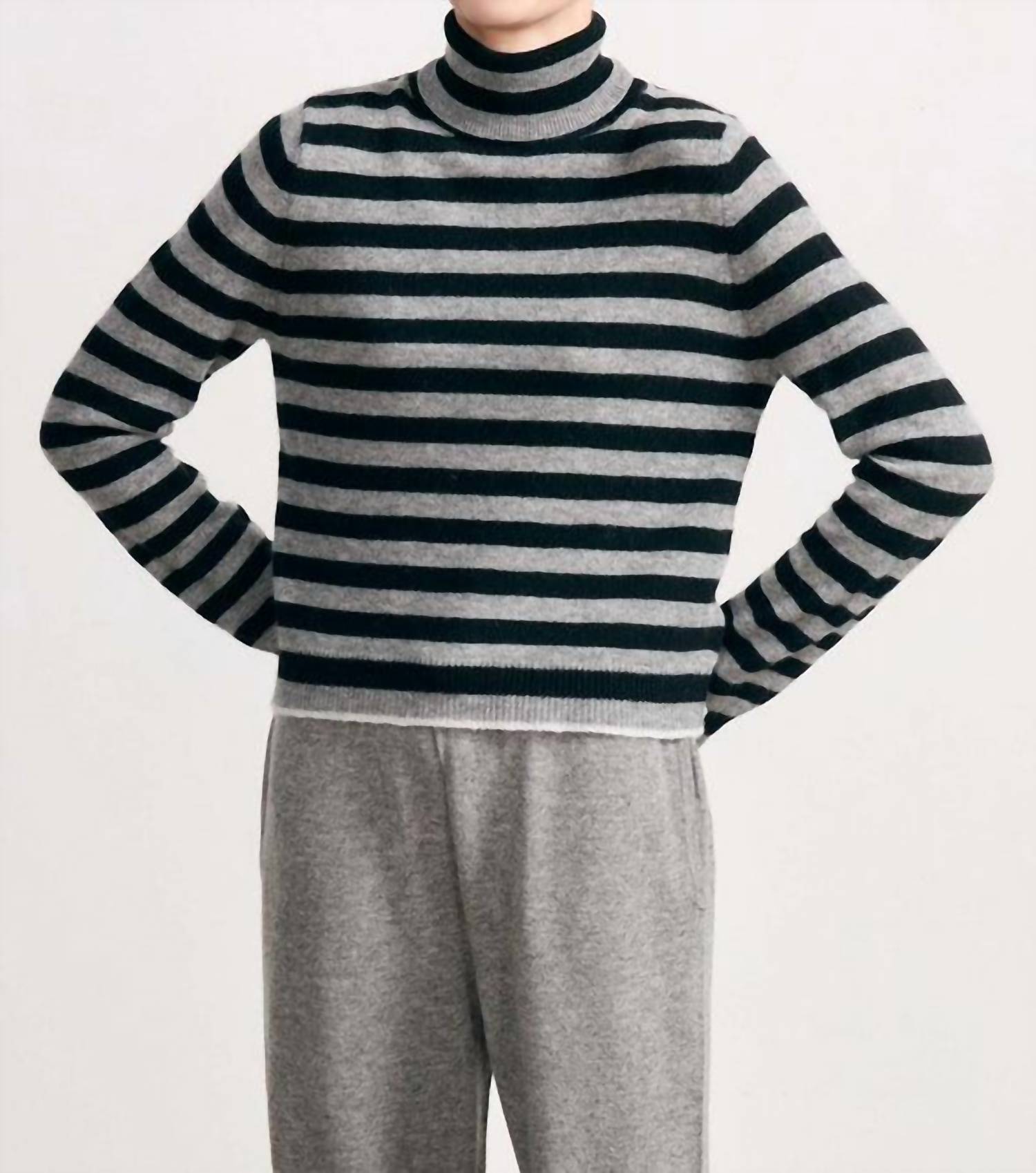 Fit to perfection and effortlessly chic. Introducing the Little Stripe Roll Collar Sweater by Jumper1234, a luxurious choice for your fall wardrobe. This women's sweater features long sleeves and a classic turtleneck design, crafted entirely from 100% cashmere for ultimate softness. Made in Mongolia, the sweater displays a chic stripe pattern in black, mid grey, and snow, with a garment length of 20.5 inches for size XS. Designed with a pull-on closure, it requires dry clean care for optimal maintenance.
