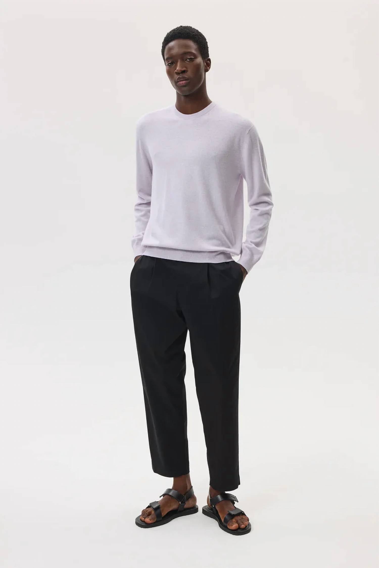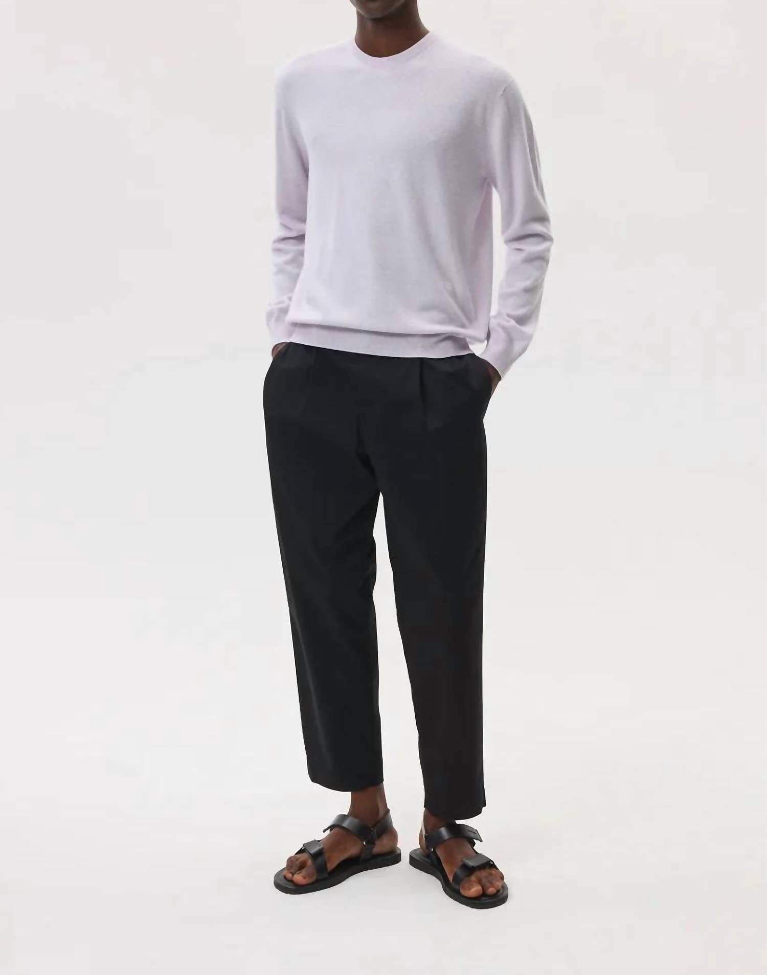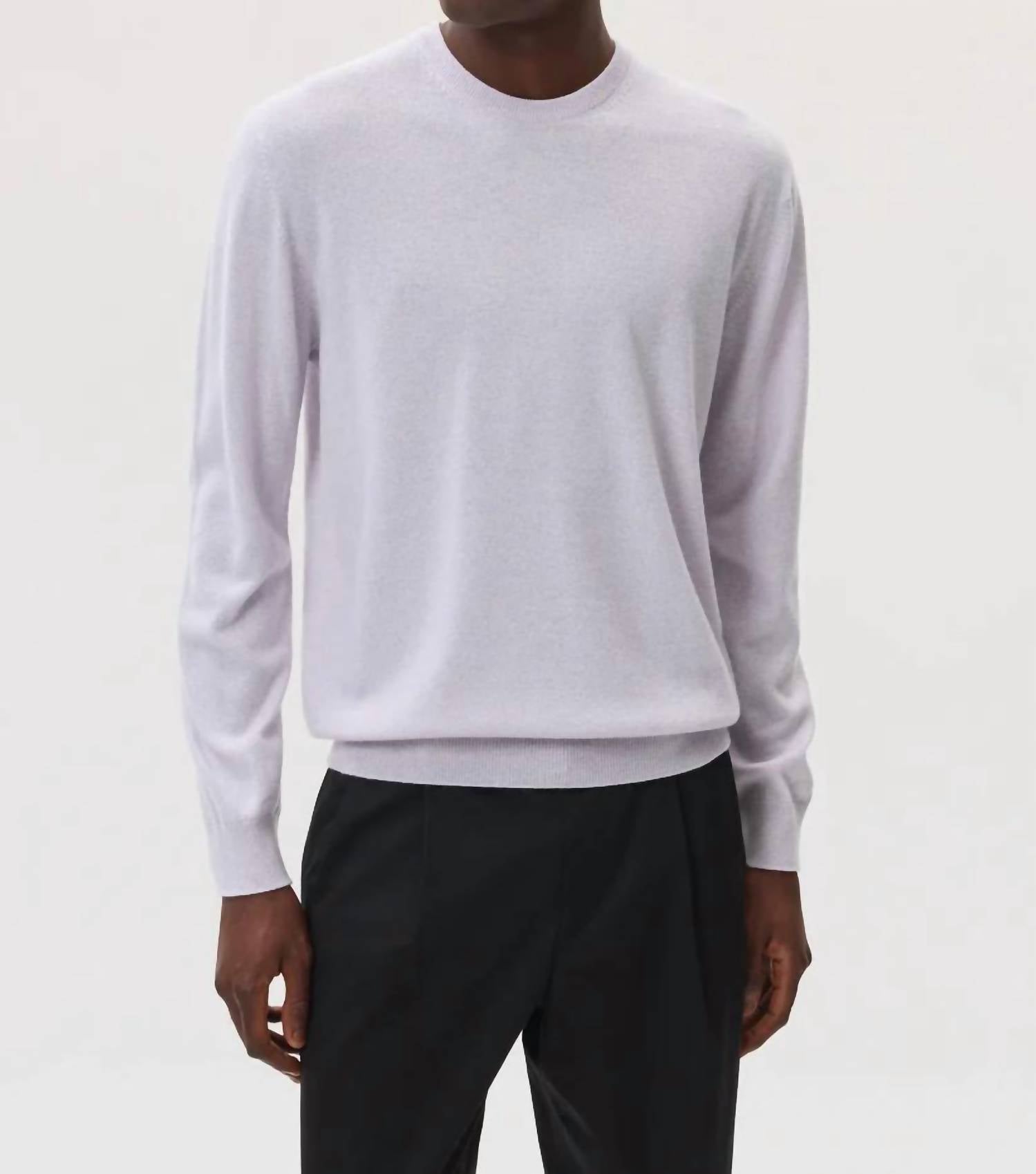 The Classic Cashmere Round Neck Sweater by Johnstons of Elgin is a men's fashion essential in a soothing lavender hue. Featuring long sleeves and crafted from 100% cashmere 2-ply, this solid crewneck sweater offers a relaxed fit that's perfect for effortless layering. Its pull-on closure ensures a seamless, comfortable wear, ideal for fall occasions. For care, simply hand wash and lay flat to dry to maintain its luxurious feel.