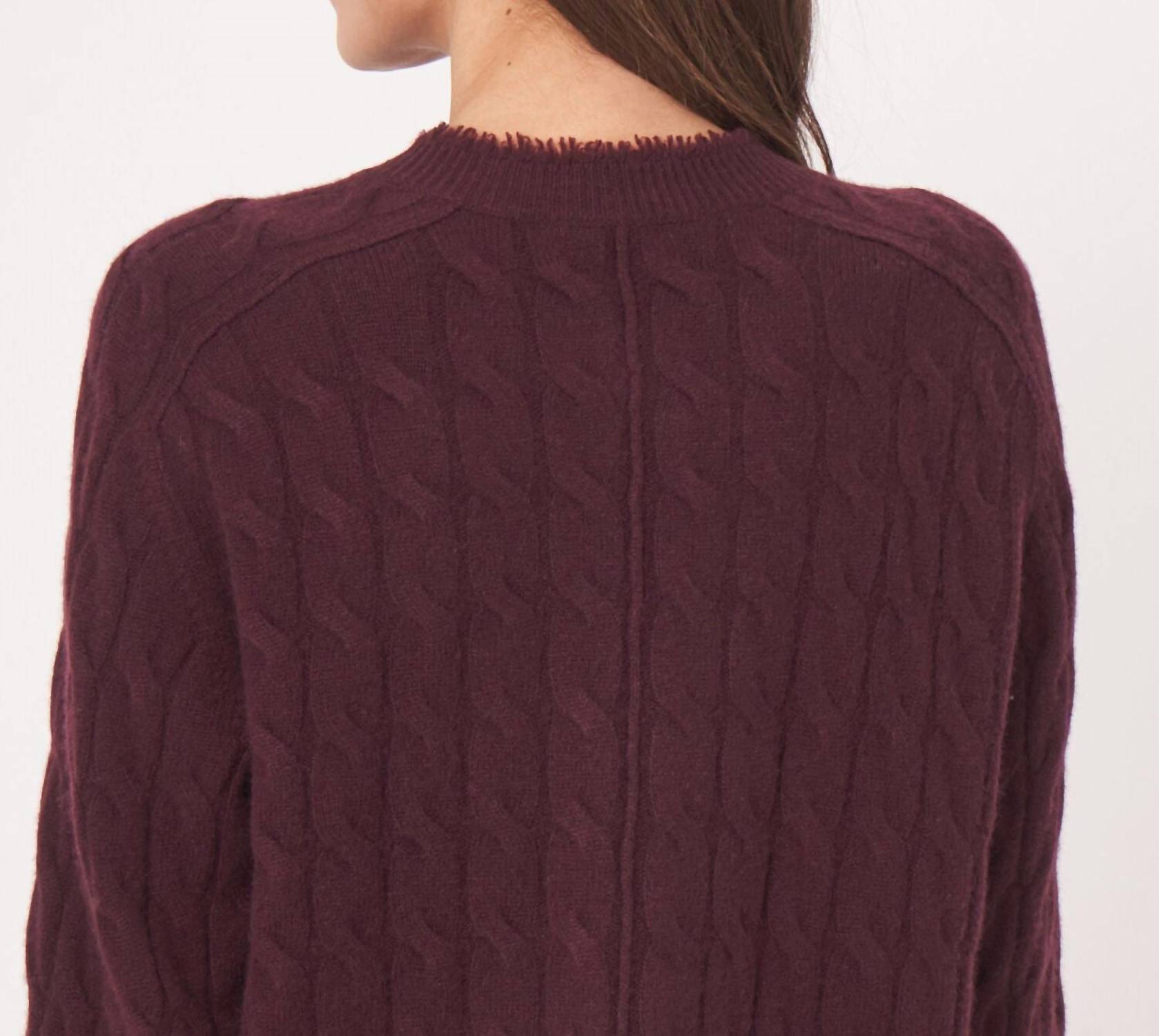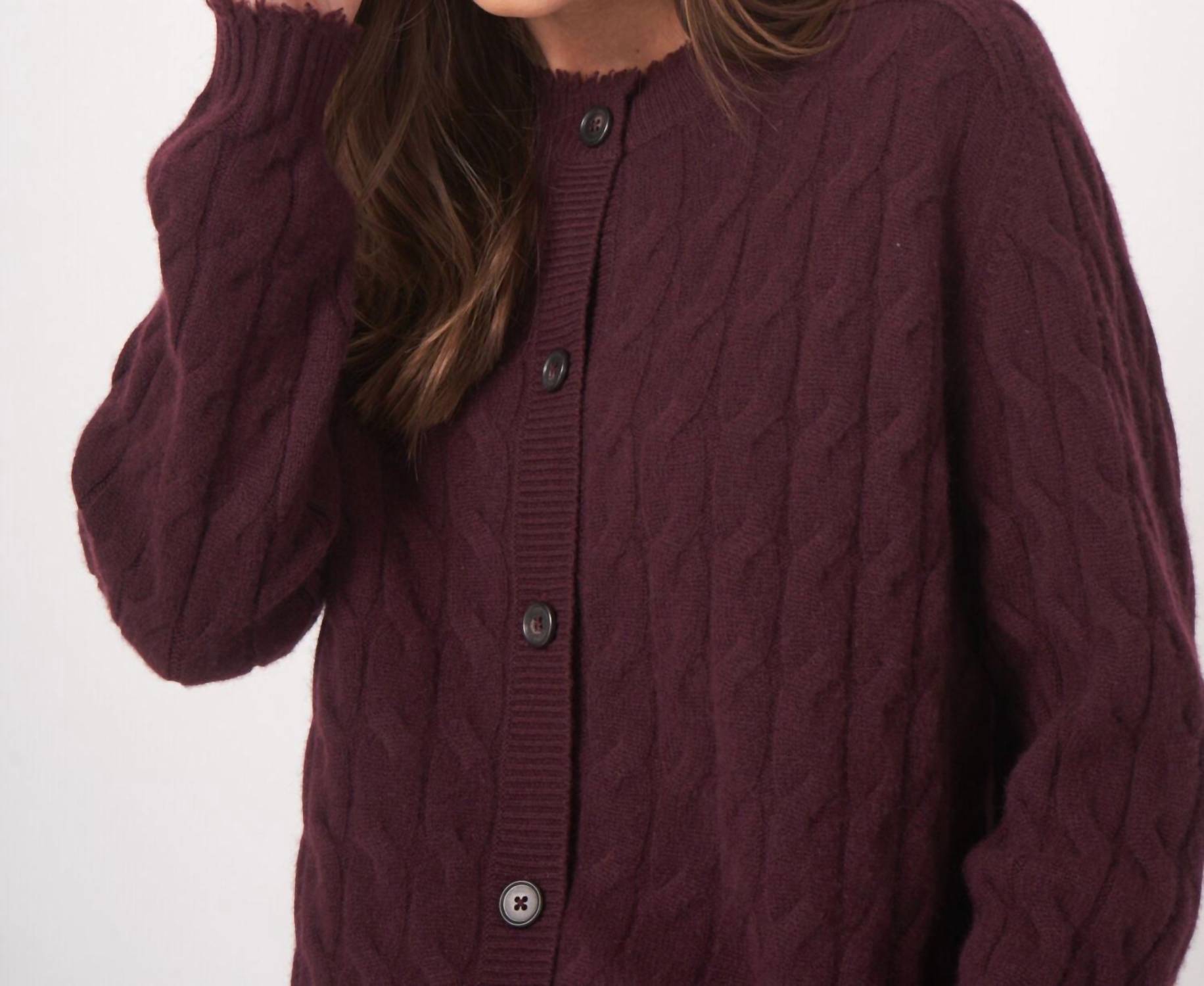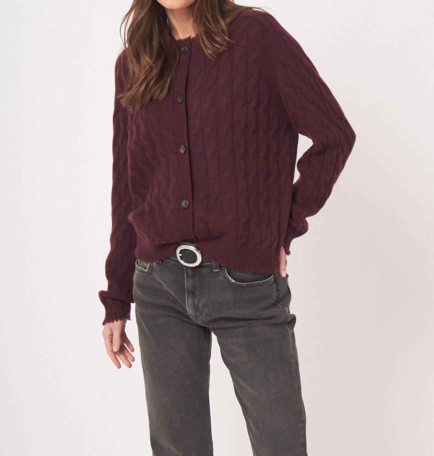 Throw this adorable cardigan over any cami or tank top. Discover the Organic Cashmere Cable Knit With Fringes Cardigan by REPEAT cashmere, offering luxurious comfort and sustainable style. This women's cardigan features a long sleeve design and is crafted from GOTS-certified 100% organic cashmere in a textured medium-weight cable knit. Adorned with fine fringes at the neckline, sleeves, and hem, and secured with a practical button closure, it is a perfect choice for Thanksgiving or dinner parties. Care: Dry clean. Ideal for those seeking minimalist elegance in a rich burgundy hue.