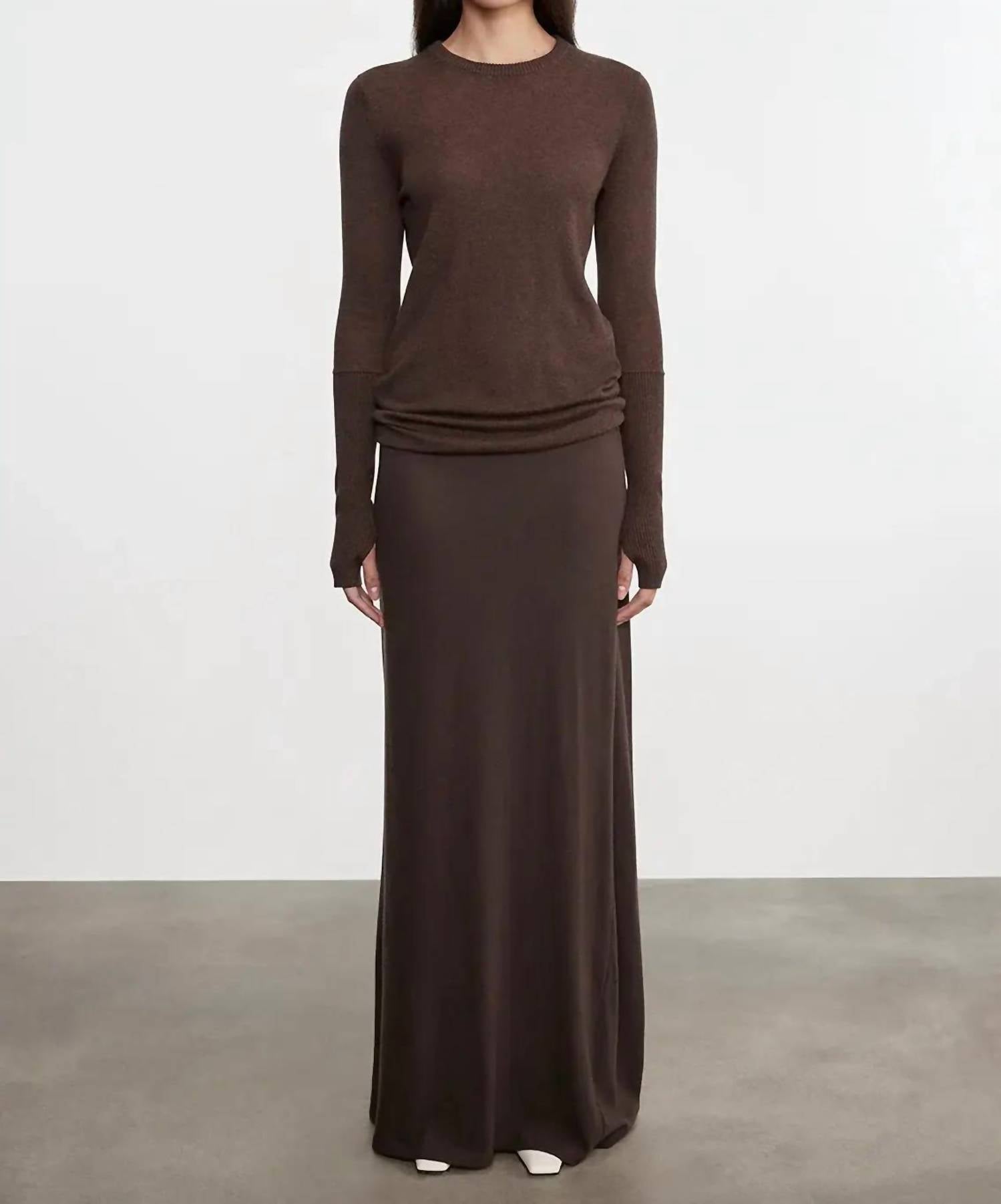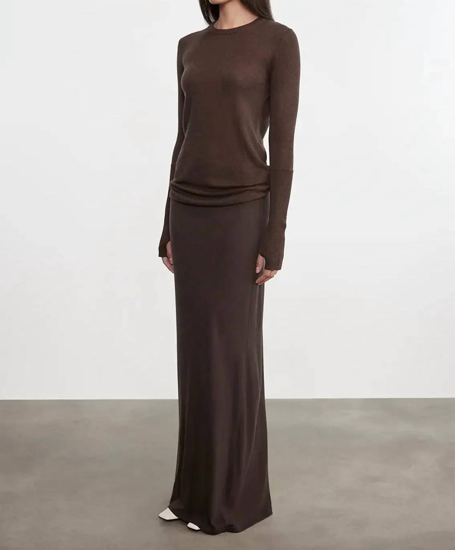 Flowy, comortable and stylish. This maxi skirt is a fan favorite. Elevate your dinner party ensemble with the Cashmere Bias Skirt by Enza Costa, a minimalist staple in dark brown. This maxi length skirt is crafted from the brand's soft cashmere blend jersey, featuring a comfortable elasticized waistband for effortless wear. Composition: 15% Cashmere, 85% Cotton. Closure: Pull on. Made in the USA.