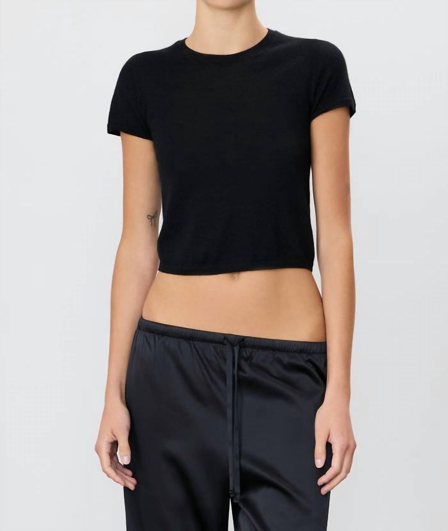 Pair this crop top with your favorite high-waisted jeans or maxi skirt. Elevate your spring wardrobe with the Cashmere Van Top by Eterne, a luxurious and minimalist piece in a soft bone hue. This women's crop top features a slim fit, crewneck neckline, and short sleeves, exuding effortless vacation style. Made from ultra soft lightweight cashmere, it fits true to size and offers a solid pattern. Closure: Pull on. Care: Dry clean only.