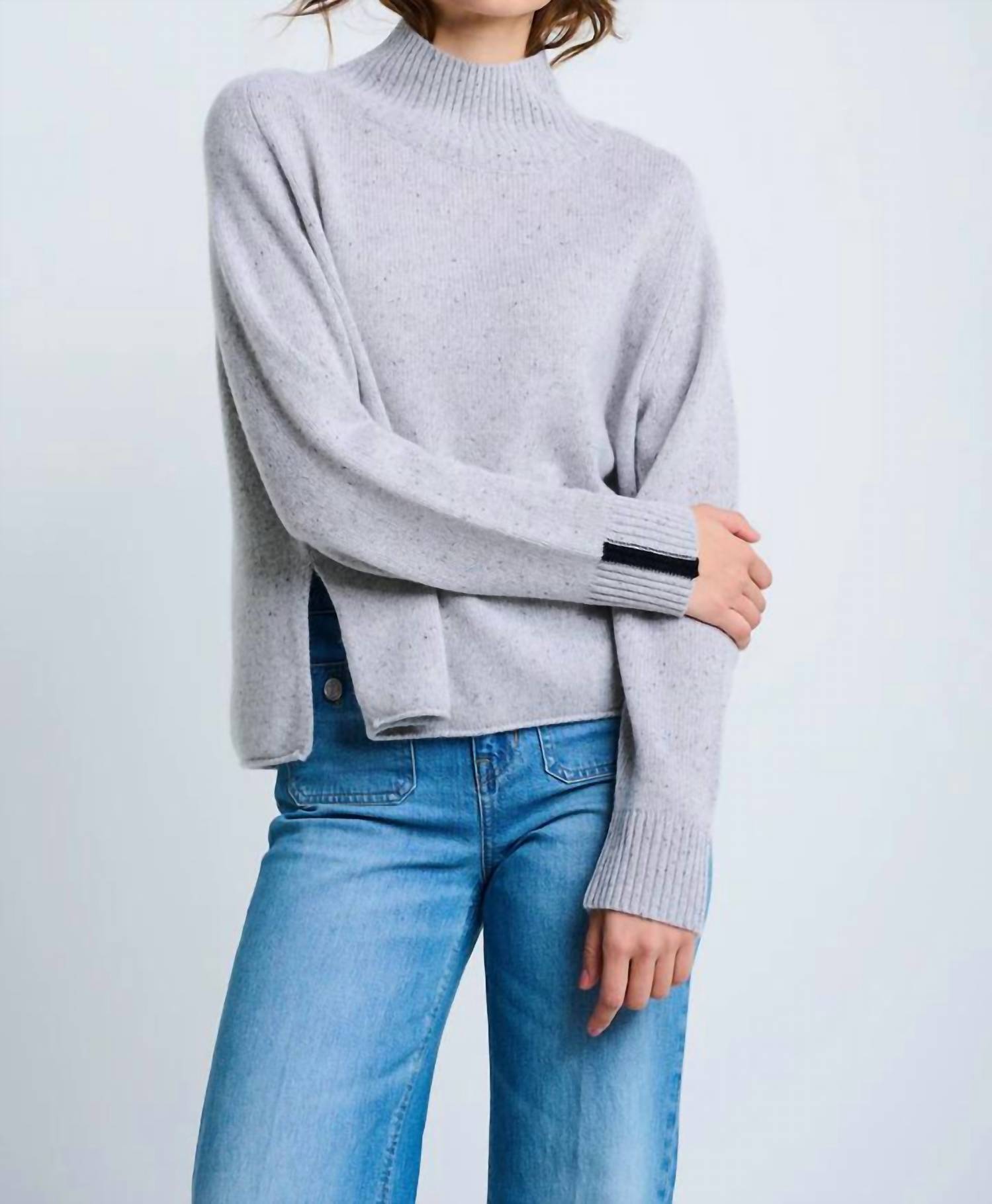 Stay warm and stylish in this versatile and effortlessly cool knitwear staple. Wear it alone or layered, it's the perfect sweater for the season and you'll wish you had it in every color. Embrace effortless elegance with the Lisa Todd Speakeasy Oversized High Neck Pullover in sophisticated Silver Mist. This luxurious long sleeve pullover is crafted from 100% cashmere, featuring a mockneck design and contrasting colorblock stripe at the ribbed cuffs for a touch of understated flair. With clean side slits and a roll edge hem, it ensures movement and softness, perfect for a minimalist fall wardrobe. Closure: Pull on. The model is 5'9" and wears a size small.