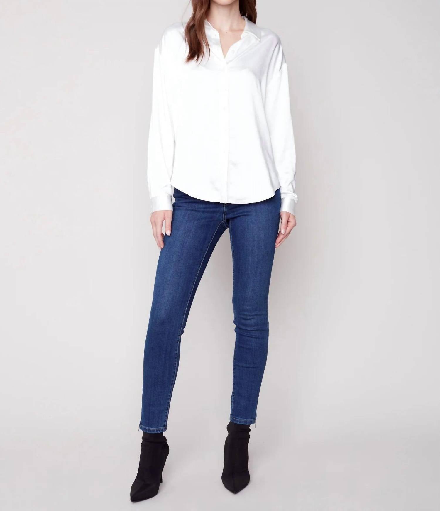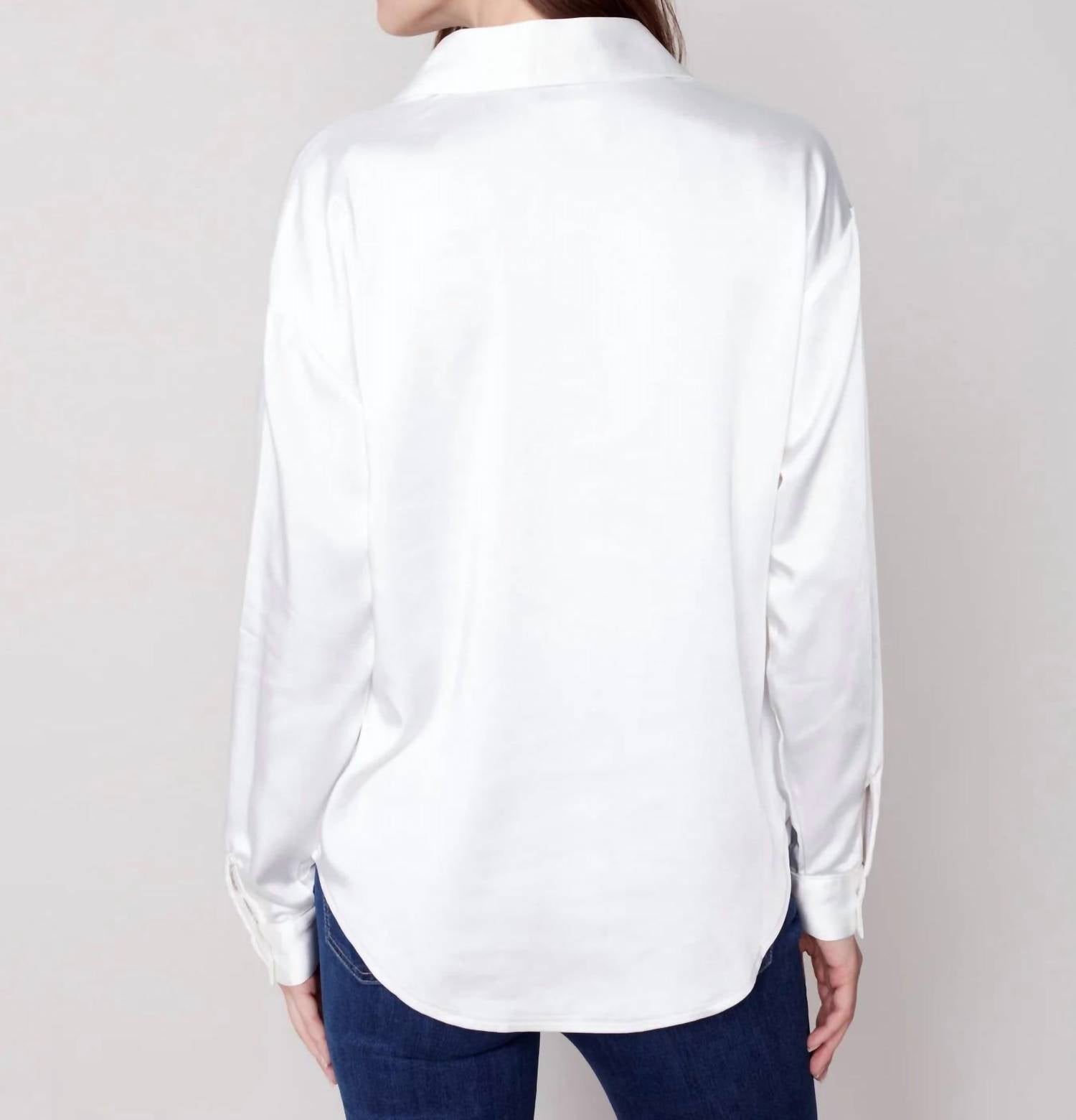 Perfectly tailored and soft to the touch. Indulge in elegance with the Harper Satin Shirt by Charlie B, a refined addition to your wardrobe. This long sleeve blouse in a solid white hue offers a perfect blend of relaxed and sophisticated style. Expertly crafted with 100% polyester, it features a classic button closure and collar neckline. For care, hand wash in cold water and line dry to maintain its lustrous appeal.