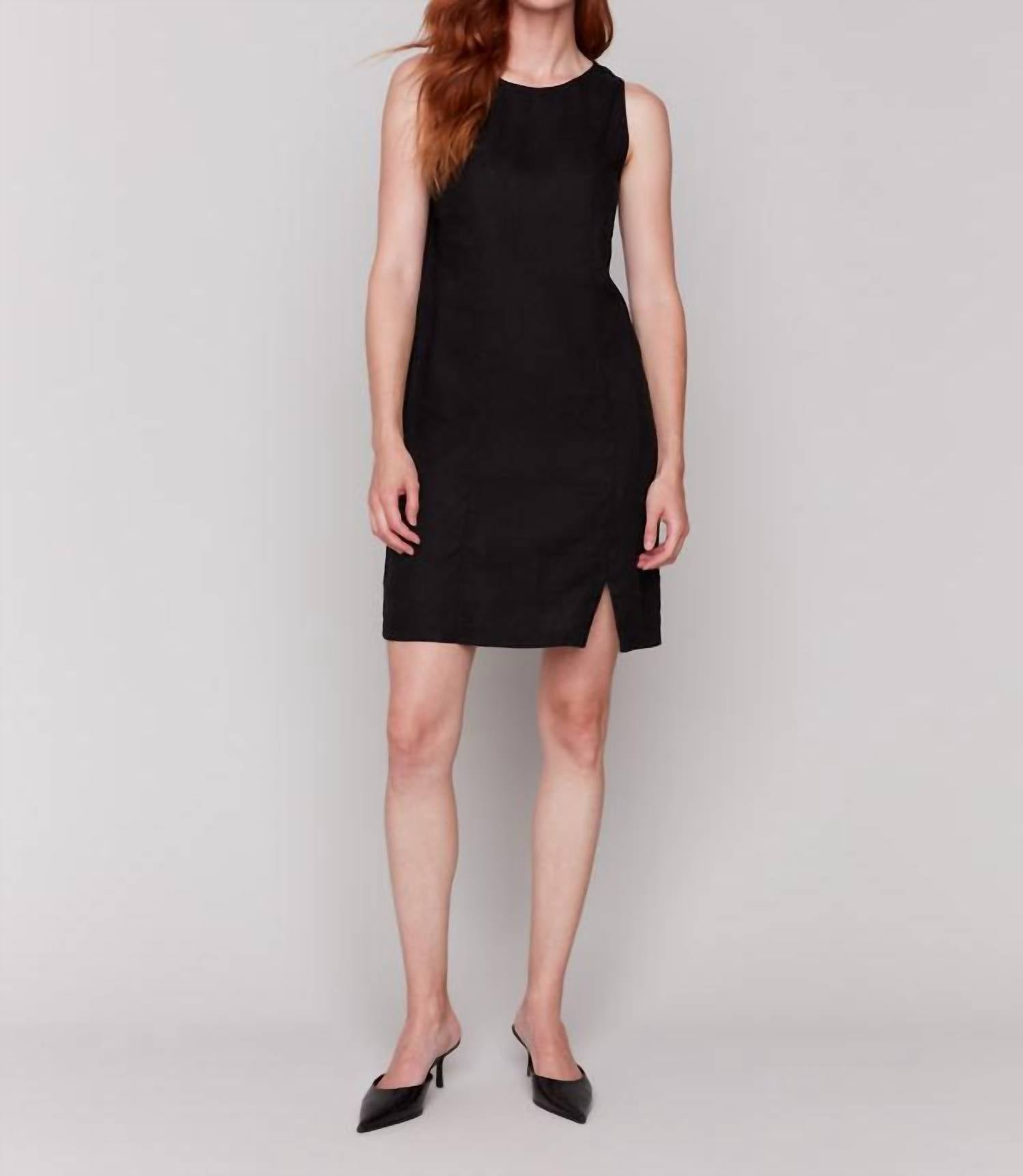 Casual, comfortable and cute! The dress that you'll be reaching for all season long. Elevate your wardrobe with the Sleeveless Linen Blend Mini Dress by CHARLIE B, an embodiment of chic elegance crafted for modern women. This knee-length sheath dress in classic black features a crewneck and alluring front slit, perfect for both casual outings and formal events. Made from a breathable linen blend, it combines comfort and style, ensuring you remain cool in warmer seasons. This pull-on dress is machine washable and can be tumble dried, embodying convenience and fashion.
