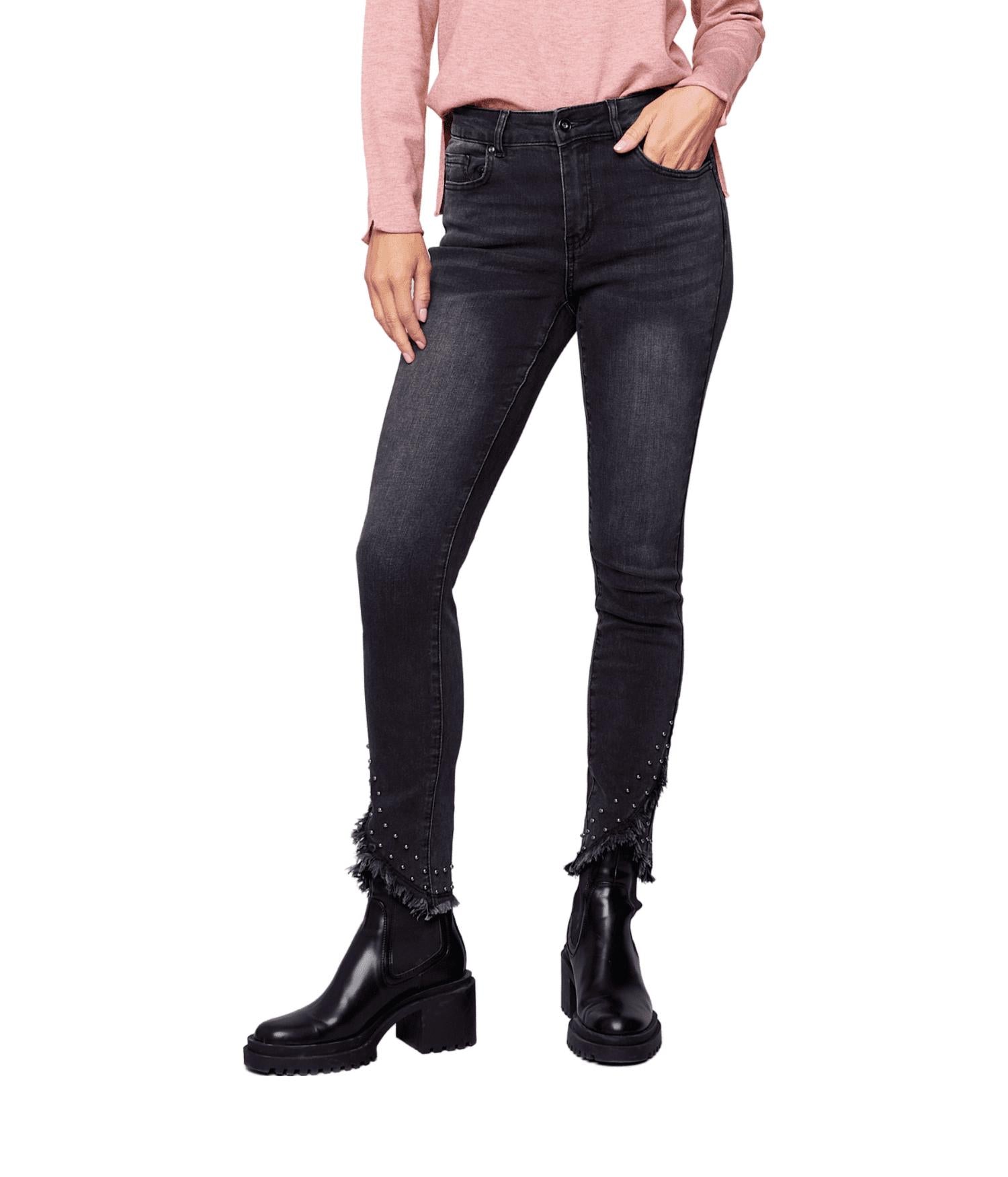 Introducing the Crossed Hem Jeans with Studs by CHARLIE B, where edgy style meets comfort in a charcoal skinny fit. Crafted from a stretchy denim blend of 73% cotton, 23% polyester, 3% viscose, and 1% spandex, these jeans feature a high rise and striking gunmetal studs for added flair. The design includes five pockets and a frayed edge, perfect for adding a chic touch to any outfit. Closure is conveniently secured with a button for effortless wear.
