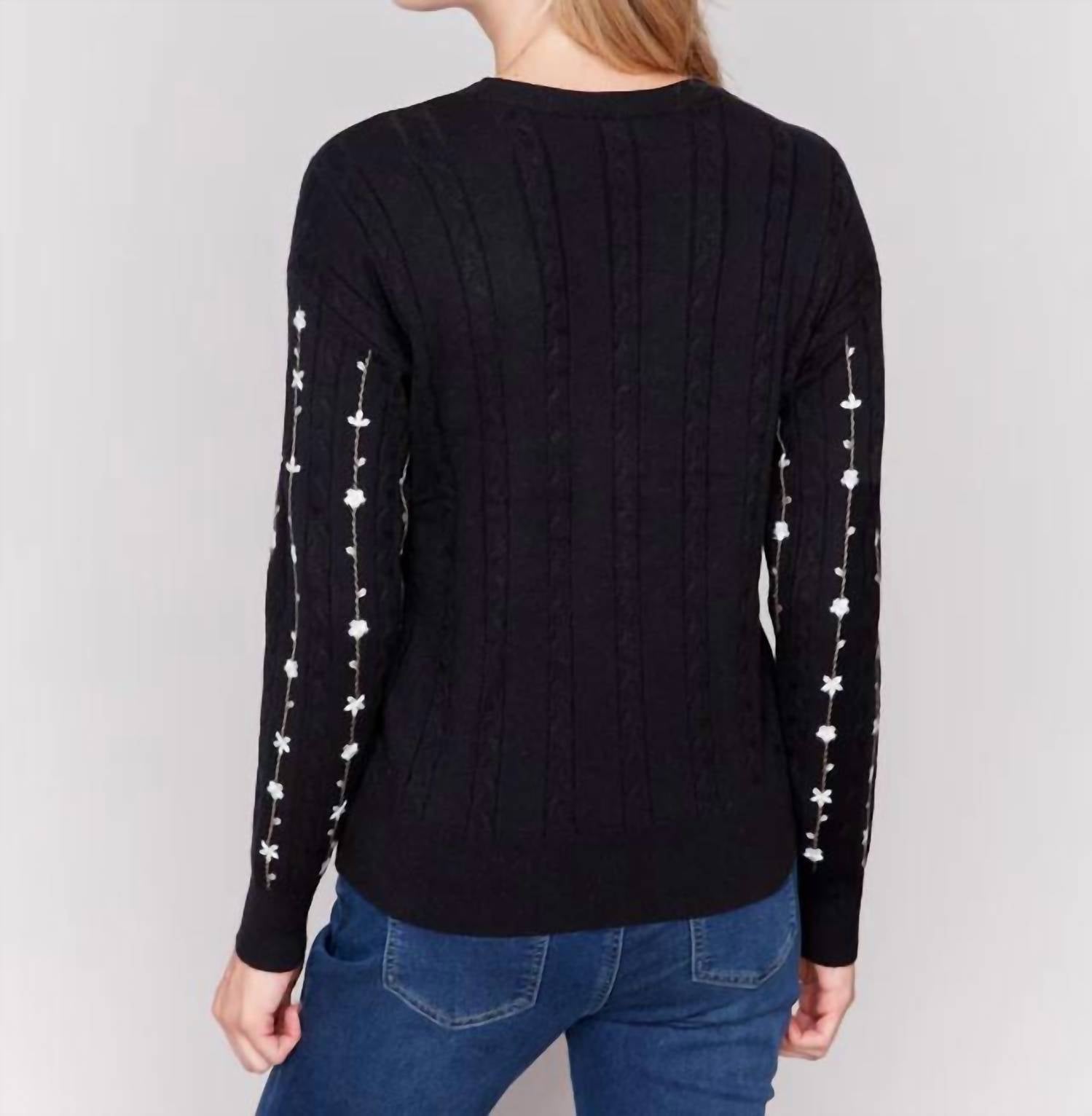 Crafted from a soft plushy knit, this long sleeve crew neck sweater features delicate floral embroidery that adds a charming touch. Perfect for cooler days, it's a versatile piece for any casual occasion. Enjoy the cozy comfort and delicate style that this black sweater brings to your wardrobe.