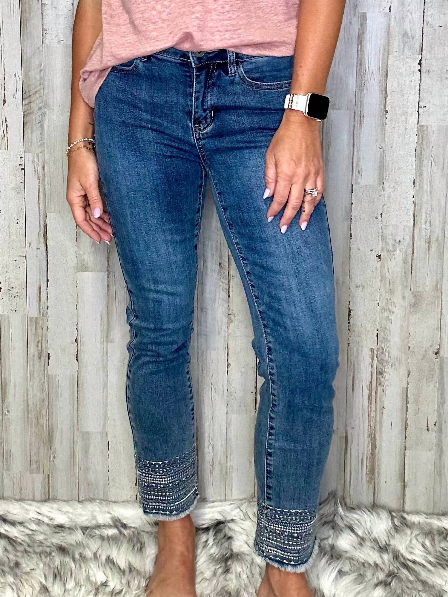 Pair these straight leg jeans with flats, sandals or even heels! You can't go wrong. Dive into the refined style of the Riverdale Stretch Denim Pant by Charlie B, crafted for streetwear enthusiasts and vacationers alike. Showcasing a low rise and straight leg cut, these blue denim pants feature a button closure and charming embroidered hem details for added flair. Made from a comfortable cotton blend (73% Cotton, 23% Polyester, 3% Viscose, 1% Spandex), these pants offer premium stretch and a relaxed fit. Care for them with a machine wash on a delicate cycle, ensuring no bleach is used, and hang to dry, with the option to dry clean if needed.