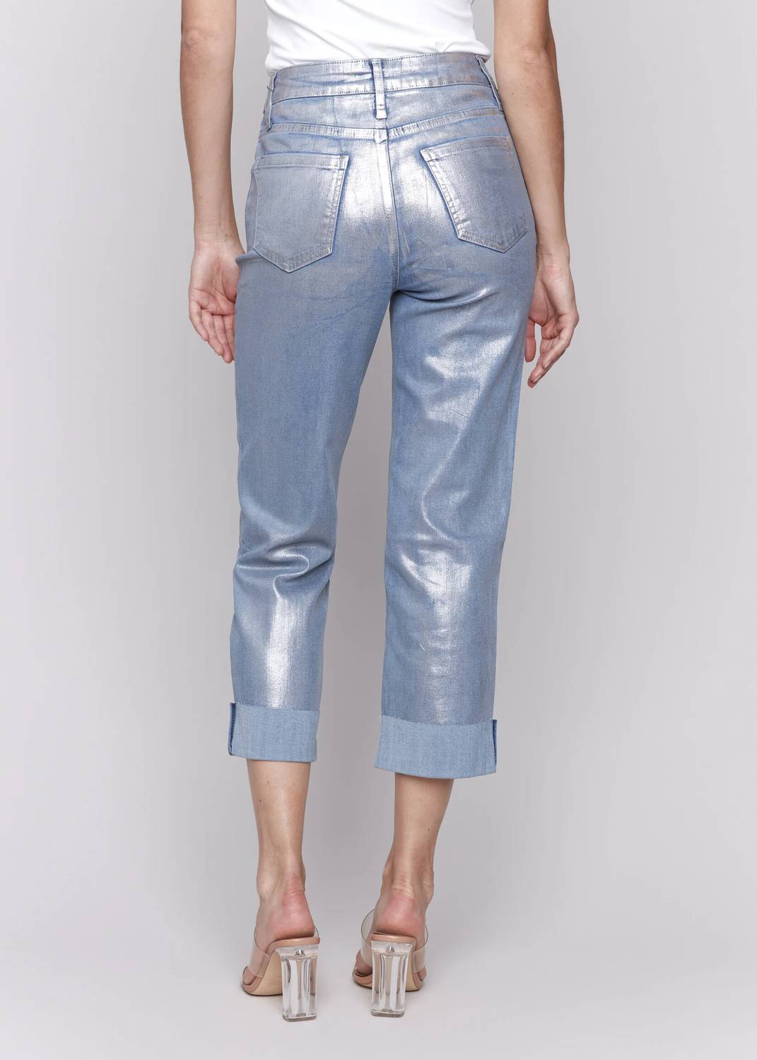 Upgrade your wardrobe with these cropped pants, designed to merge sophistication and wearability. The tailored fit ensures ultimate comfort during long days or nights out. Elevate your closet with the Foil Cuff Pant by CHARLIE B in a captivating bleach blue. These straight-leg jeans feature a foiled finish with a chic cuffed hem, crafted from stretch fabric for ultimate comfort. Designed with a high-rise and zip closure, they provide a sleek slim fit for an effortlessly elegant silhouette. Whether for a concert or a casual day out, these cropped pants transition seamlessly, embodying both style and adaptability.