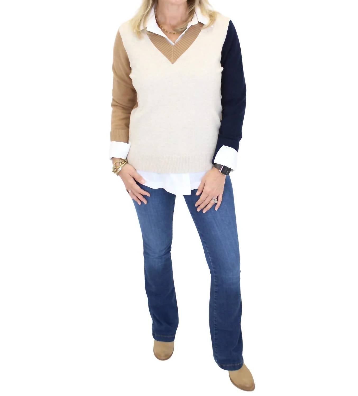 Wear this v-neck sweater with your favorite denim for the perfect fall look. Introducing the Colorblock V-Neck Sweater by Charlie B, a stylish addition to your wardrobe in a sophisticated truffle tone. This women's long sleeve piece is crafted from a soft viscose blend, featuring a modern colorblock pattern with truffle, oatmeal, and navy hues. The sweater boasts ribbed cuffed sleeves for added comfort and style, and it transitions effortlessly from casual to polished looks. Care: Hand wash cold, line dry, low iron or steam if needed. Closure: Pull on. Model Beth is 5'6", size 6, wearing a size Small.