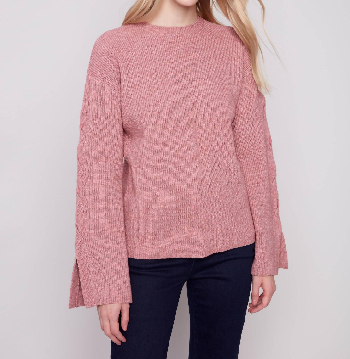The ultimate go-to sweater, expertly crafted to provide the perfect combination of warmth and style. Its classic design and soft fabric make it a must-have addition to your wardrobe. Introducing the Crew Neck Sweater With Cable Sleeves by CHARLIE B, a must-have piece for your spring wardrobe. This women's sweater in denim features long sleeves with intricate cable detailing, perfect for a holiday party or casual outing. The pull-on closure makes it easy to wear, while the solid pattern and crewneck design offer a classic and timeless look.