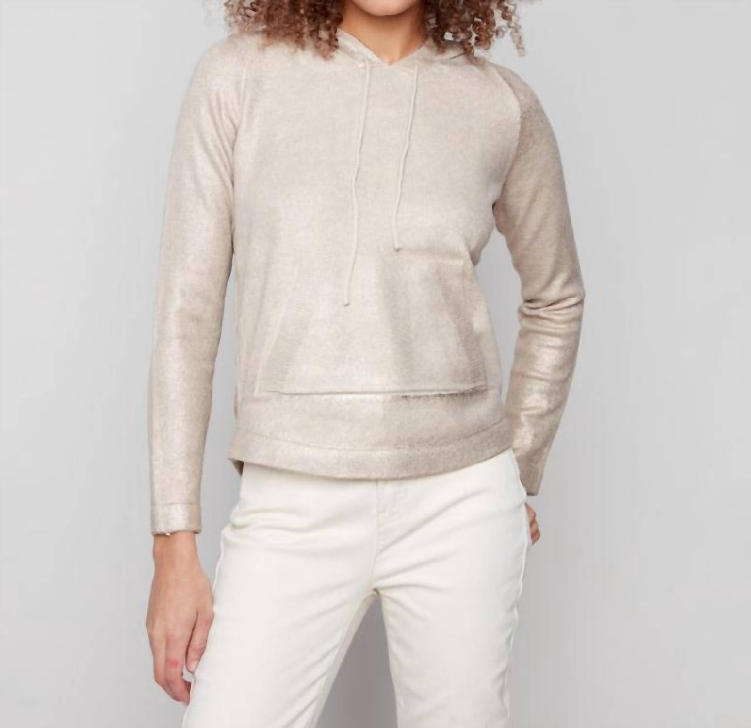 You'll be reaching for this comfy and classic v-neck sweater all season long. Discover the Metallic Knit Hoodie Sweater by CHARLIE B, designed to add elegance to your holiday season with its champagne hue and gentle shimmer. This 48% Viscose, 27% Nylon, And 25% Polyester blend sweater features long raglan sleeves and a comfortable hood with a drawstring for adjustable style. The pull-on design includes a practical front pocket and measures a versatile 24.5 inches in length. Care for this chic piece by hand washing and laying it flat to dry.