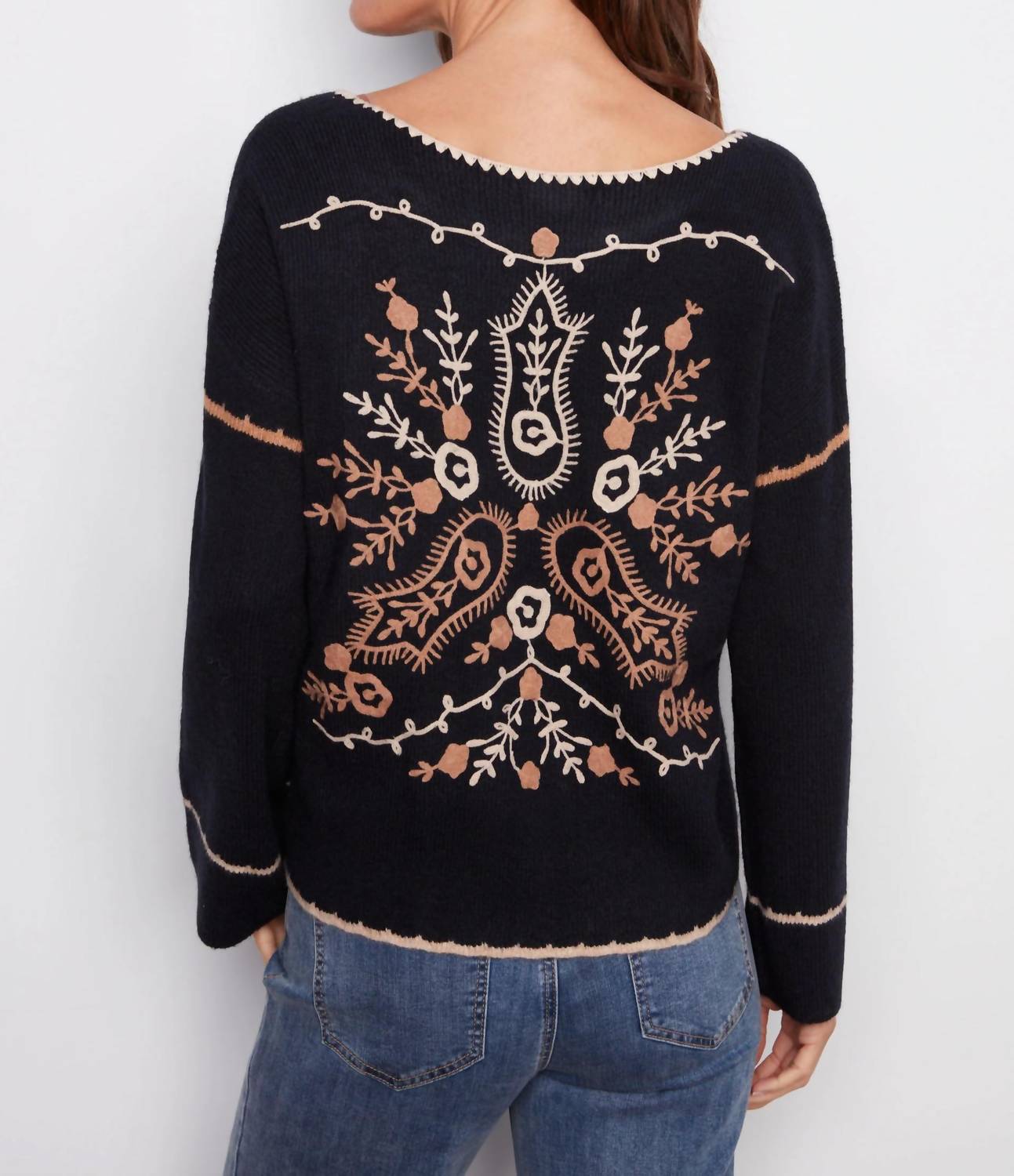 A timeless v-neck sweater that works season after season. Embrace the essence of Boho Chic this fall with the Notch Neck Embroidered Sweater by CHARLIE B in a sophisticated navy. Crafted from acrylic, this long-sleeve sweater features a stylish notch neck, drop shoulders, and a ribbed texture, enhanced by elegant beige back embroidery. Its relaxed fit makes it perfect for both casual outings and special occasions, offering versatile style through a pull-on closure. For care, simply hand wash and lay flat to dry.