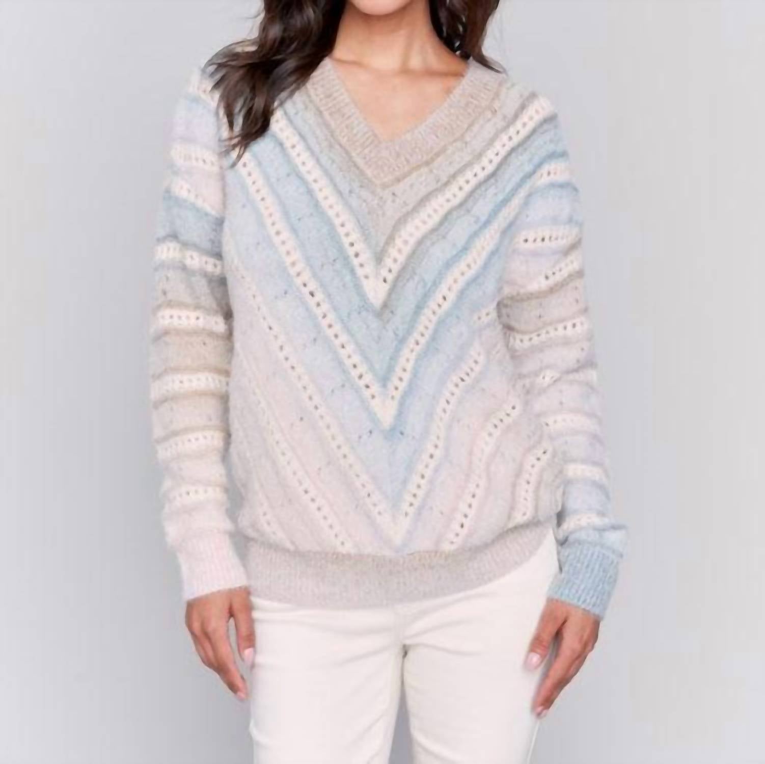 Wear this v-neck sweater with your favorite denim for the perfect fall look. Stay warm with the Seabrook V-Neck Sweater by Charlie B, a stylish addition to your fall wardrobe. Featuring long sleeves and an ombre chevron knit pattern, this frost-colored sweater is designed with playful open stitch detail. Made from a blend of 50% Acrylic, 30% Nylon, and 20% Viscose, it offers comfort and style. Closure: Pull-on style. Care: Hand wash in cold water, do not bleach, lay flat to dry, iron at a low setting, or dry clean if needed.