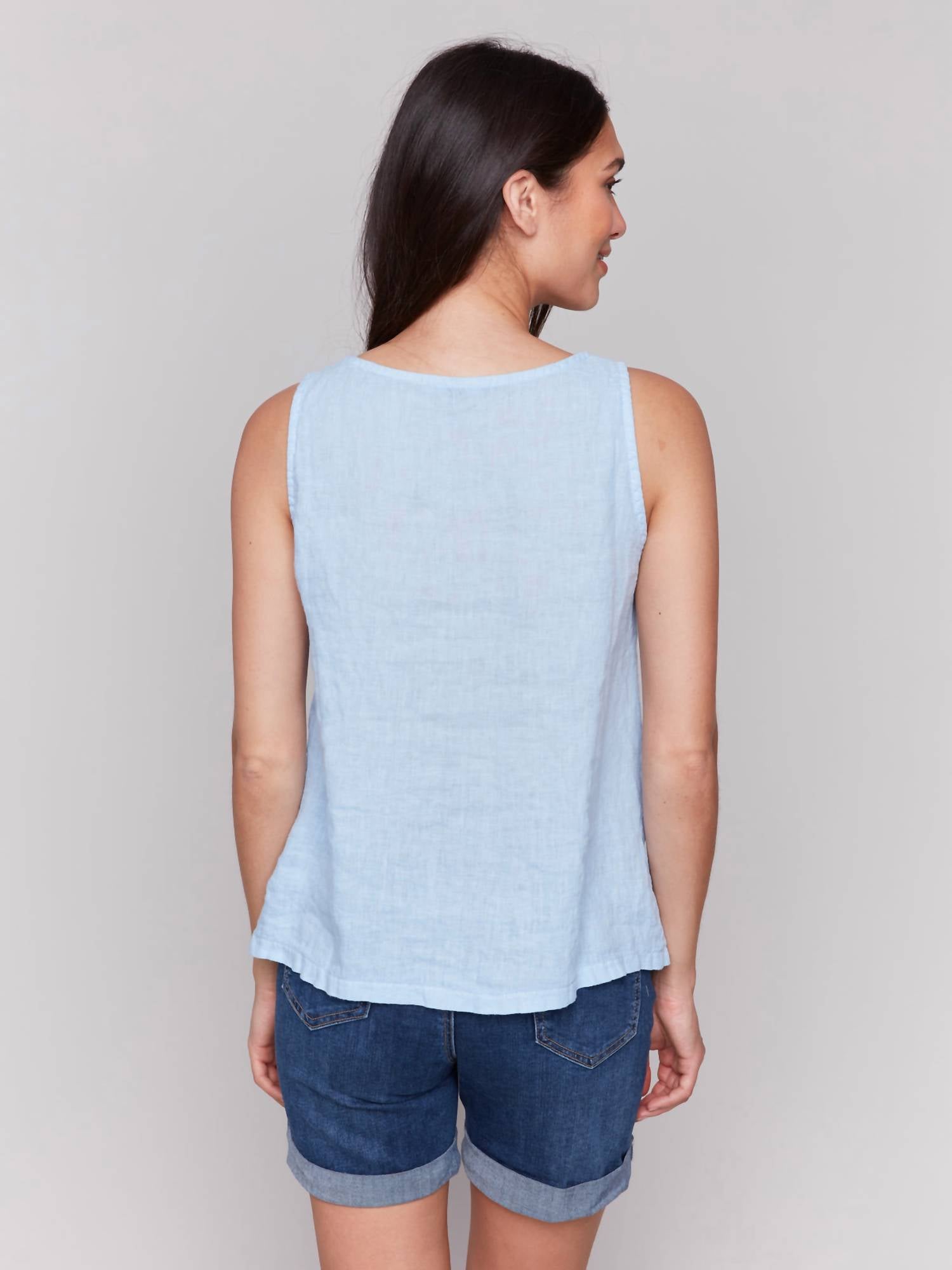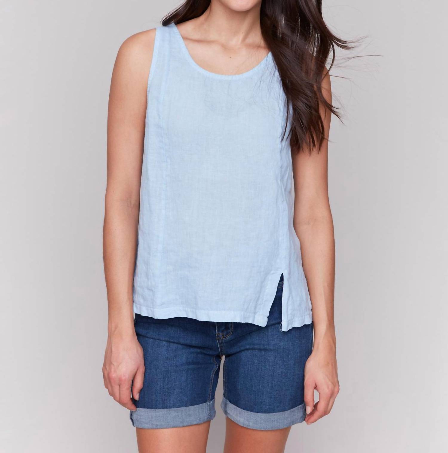 This classic tank top is perfect for layering and cute enough to wear on its own. Embrace summer styling with the Sleeveless Linen Top by CHARLIE B, crafted in a standout bluebell hue. This minimalist sleeveless design features chic slits for a breezy feel. Material: 100% Linen. Closure: Pull on. Care: Hand wash, line dry. Perfect for holiday parties and warm weather events.