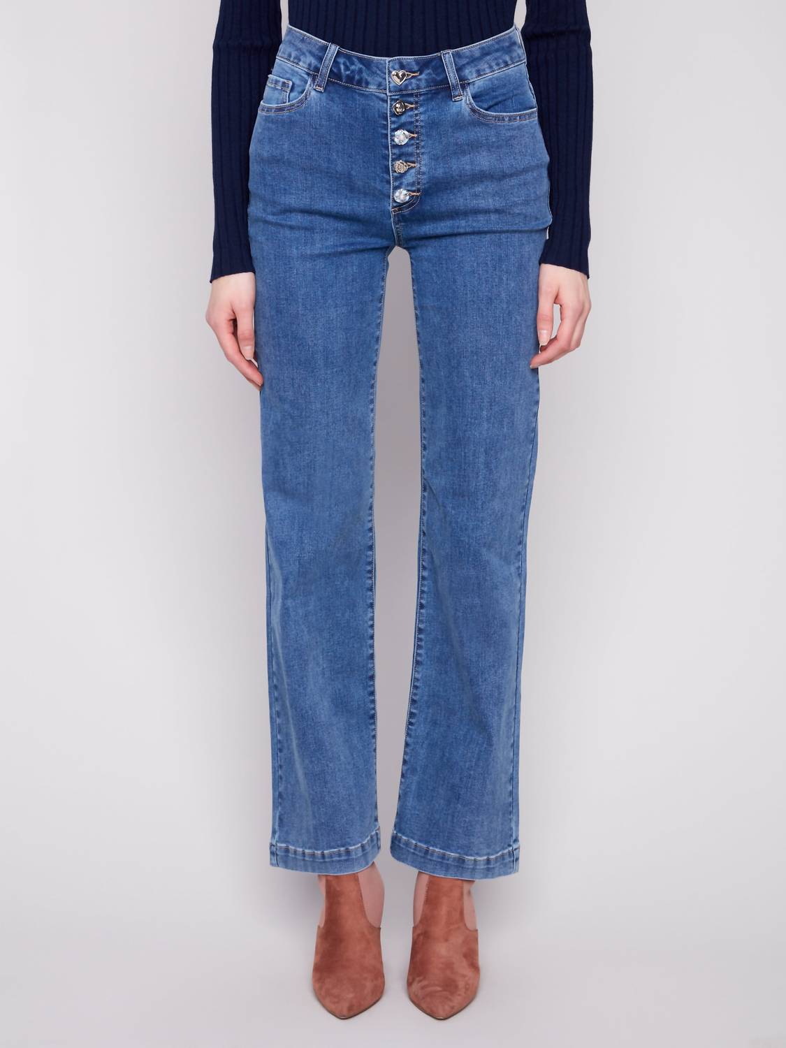 These must-have jeans are fit to perfection. Introducing the Stretch Denim with Embellished Buttons by Charlie B, a perfect addition for your spring wardrobe. These women's denim pants in a medium wash blue feature a classic straight-leg fit and high-rise waist, ideal for a holiday party or casual outing. The solid pattern is complemented by a zip closure and functional pockets, adding practicality to style. Made with denim, these pants embody a blend of comfort and modern elegance.