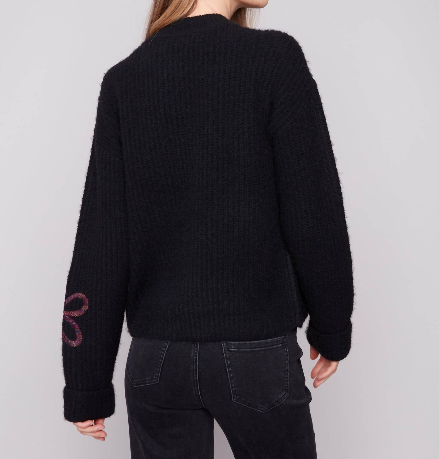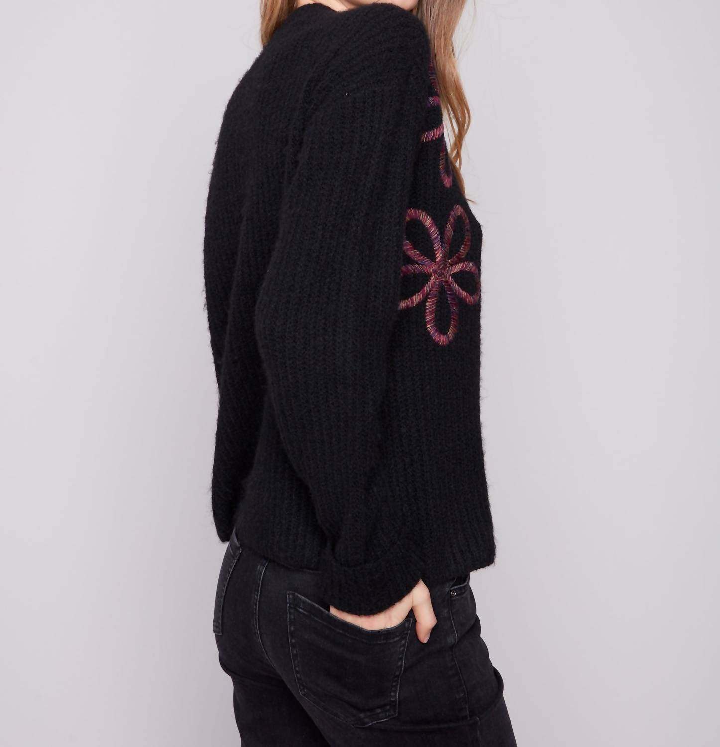 The ultimate go-to sweater, expertly crafted to provide the perfect combination of warmth and style. Its classic design and soft fabric make it a must-have addition to your wardrobe. Step out in style with the Embroidered Flowers Sweater by Charlie B, a chic addition to any holiday party outfit. This women's long sleeve sweater, designed in a classic crewneck style, features a beautiful floral pattern that stands out against a timeless black backdrop. Closure is a convenient pull-on style. Perfect for spring, this piece is both comfortable and effortlessly elegant.