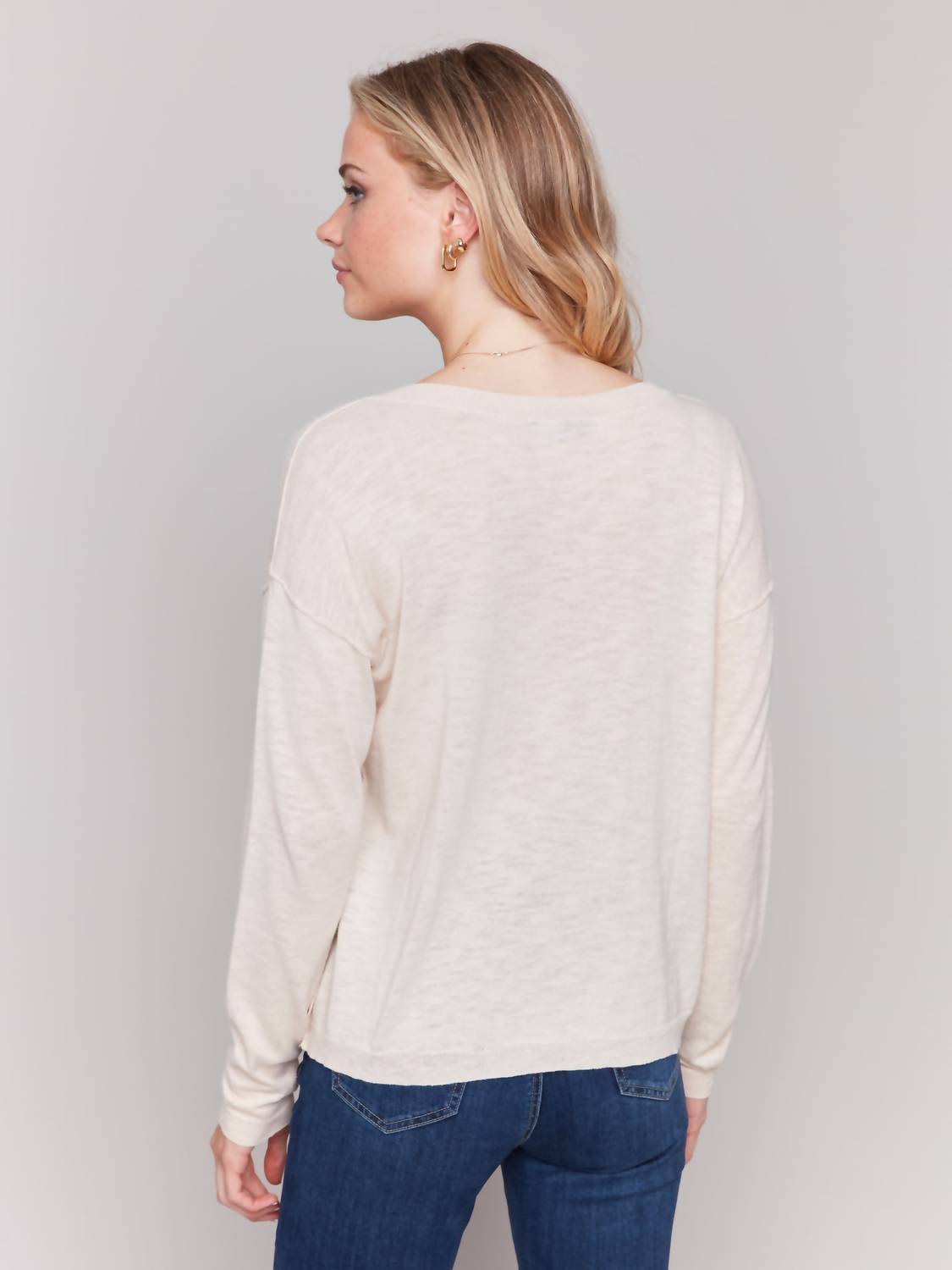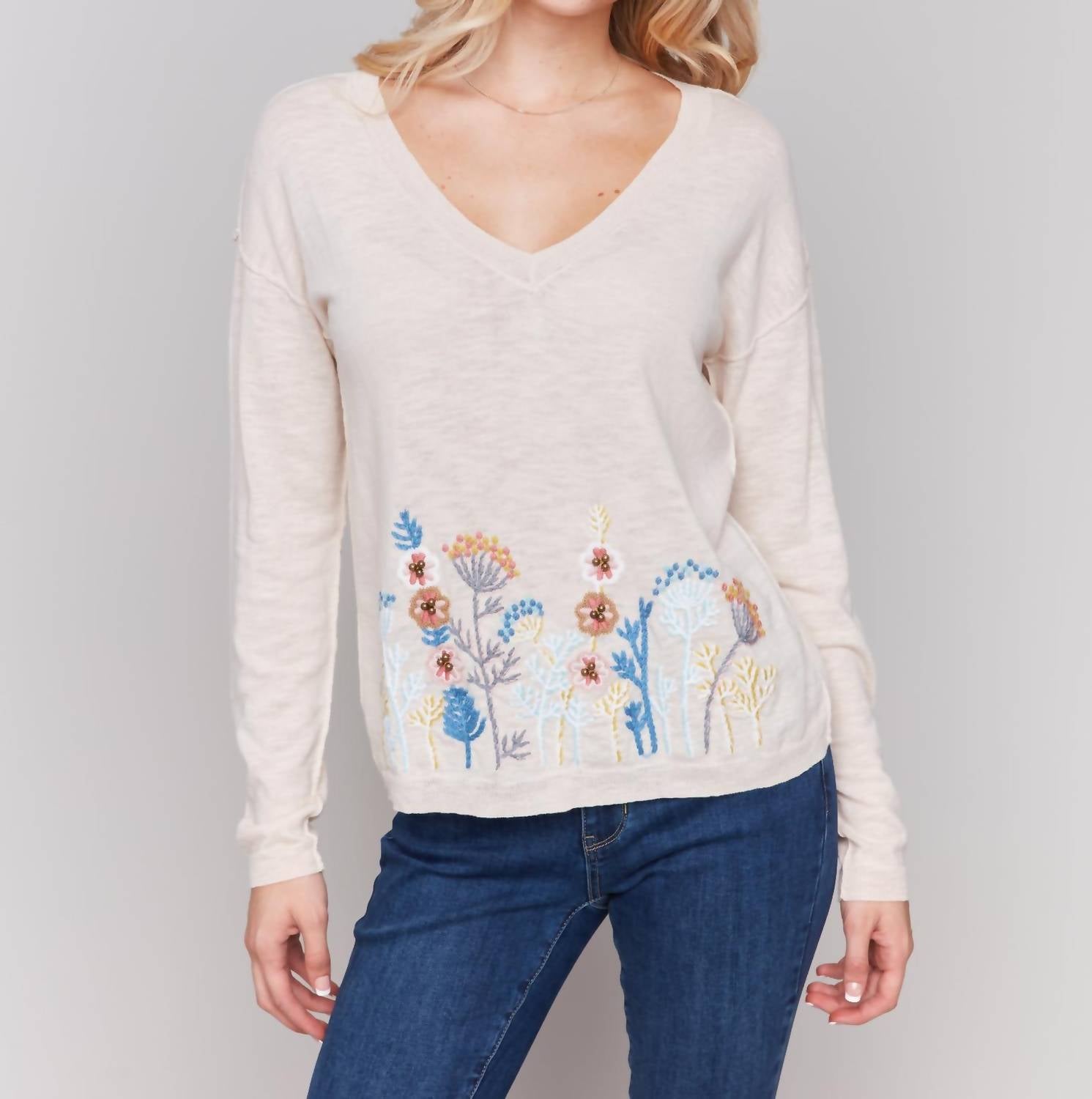 A timeless v-neck sweater that works season after season. Introducing the V-neck Cotton Sweater by Charlie B, an effortlessly stylish piece for your wardrobe in tan with floral embroidery. This long sleeve sweater is crafted from 100% cotton, ensuring a soft, comfortable fit with a straight silhouette and drop shoulder design. Featuring a timeless V-neckline, it is perfect for layering without being too heavy. Closure: Pull-on. Care: Machine wash, lay flat to dry.