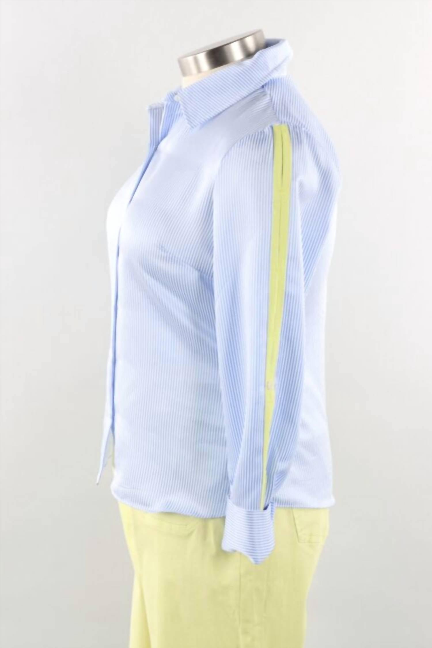 A versatile blouse that works from desk to dinner! Meet the Women's Striped Blouse by CHARLIE B, a chic addition to any wardrobe with its sky blue stripes that evoke a summery vibe. The blouse features long sleeves adorned with sunshine bias tape and buttoned cuffs, complete with a pointed collar for a touch of refinement. Crafted from 100% polyester, this 24-inch length top ensures comfort and style. Closure: Button closure. Care: Machine wash cold, hang to dry.