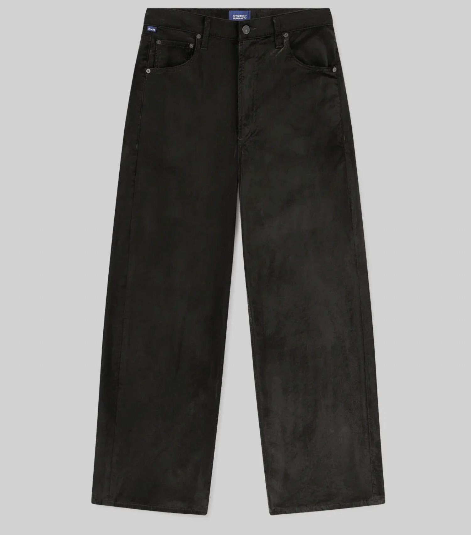 Discover the Ayla Baggy Pants by Citizens of Humanity, perfect for those who embrace a refined baggy silhouette. Crafted from ultra-soft velvet with added stretch, these pants come in a luxe olive leaf shade and feature a high rise with a 12" rise and 31" inseam, ending in a 20 1/2" leg opening. Made with 54% Cotton, 44% Rayon, and 2% Spandex for comfort. Closure: Zip fly. Care: Machine wash cold inside out with like colors, tumble dry low.
