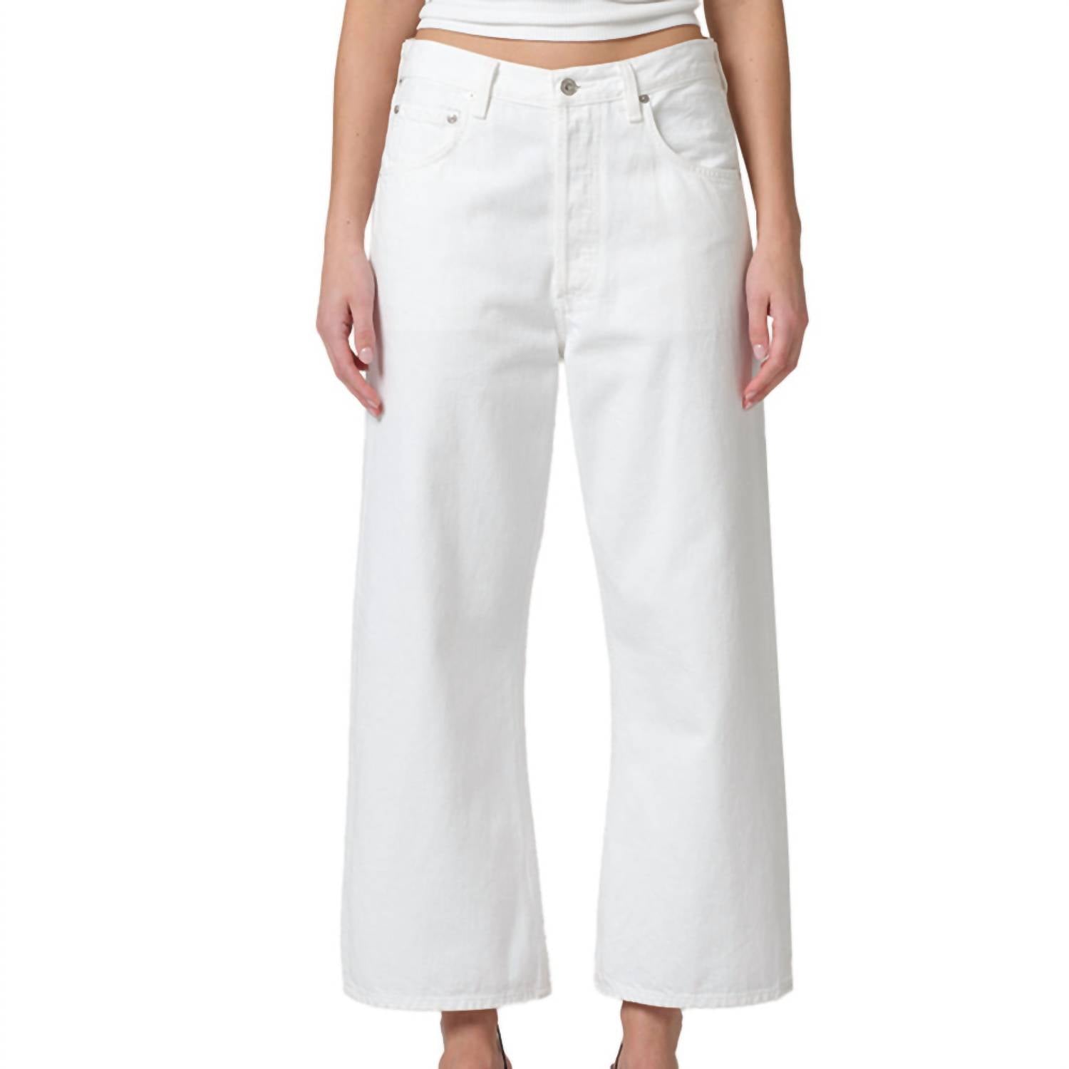 Pair these wide leg jeans with mules, slides or your favorite strappy sandals. Discover the Gaucho High Rise Wide Leg Jeans by Citizens of Humanity, a perfect addition to your spring wardrobe in a chic white colorway. Crafted from 100% cotton, these jeans feature a relaxed fit and high-rise waist for ultimate comfort and style. Their solid pattern and wide-leg design make them an essential choice for streetwear or vacation occasions. Closure: Button closure. Care: Machine wash, tumble dry.
