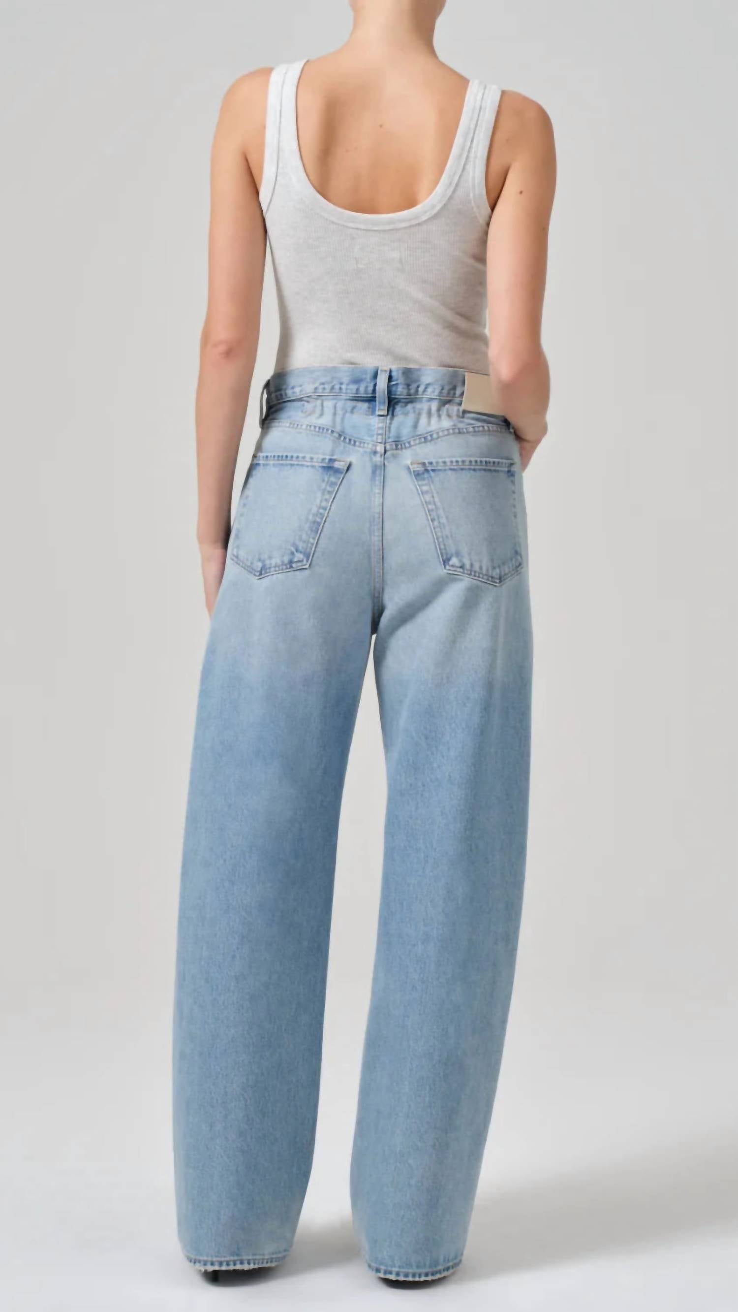 Pair these straight leg jeans with flats, sandals or even heels! You can't go wrong. Introducing the Gwendoline High Rise Scrunch Jean by Citizens of Humanity, a stylish choice in Dakota with a subtle vintage appeal. These jeans are crafted from 100% regenerative cotton, offering a high-rise waist and a relaxed fit with straight, wide legs for effortless comfort. Closure is provided by a button fly, and they feature a classic five-pocket construction. Product measurements from size 26 include a 12.5" rise, 31" inseam, and a 20.5" leg opening. Care: Machine wash cold inside out with like colors, do not bleach, tumble dry low. Model is wearing a size 26 (5' 7.5" height, 34.5" bust, 29" waist, 38" hips).