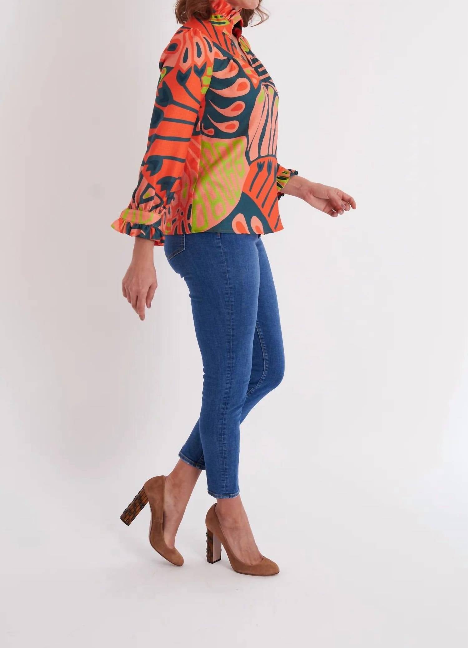 Pair this with your favorite jeans and slides for your next girls night out. We are so excited... our tried-and-true Aspen Blouse is back and we're loving it in our NEW Falcon Print! Just consider the milage this blouse will get! Simply throw on your favorite jeans and Mary Jane flats and you’re ready to go! Details: V-Neck Ruffle stand up collar Ruffle Cuff 100% Cotton