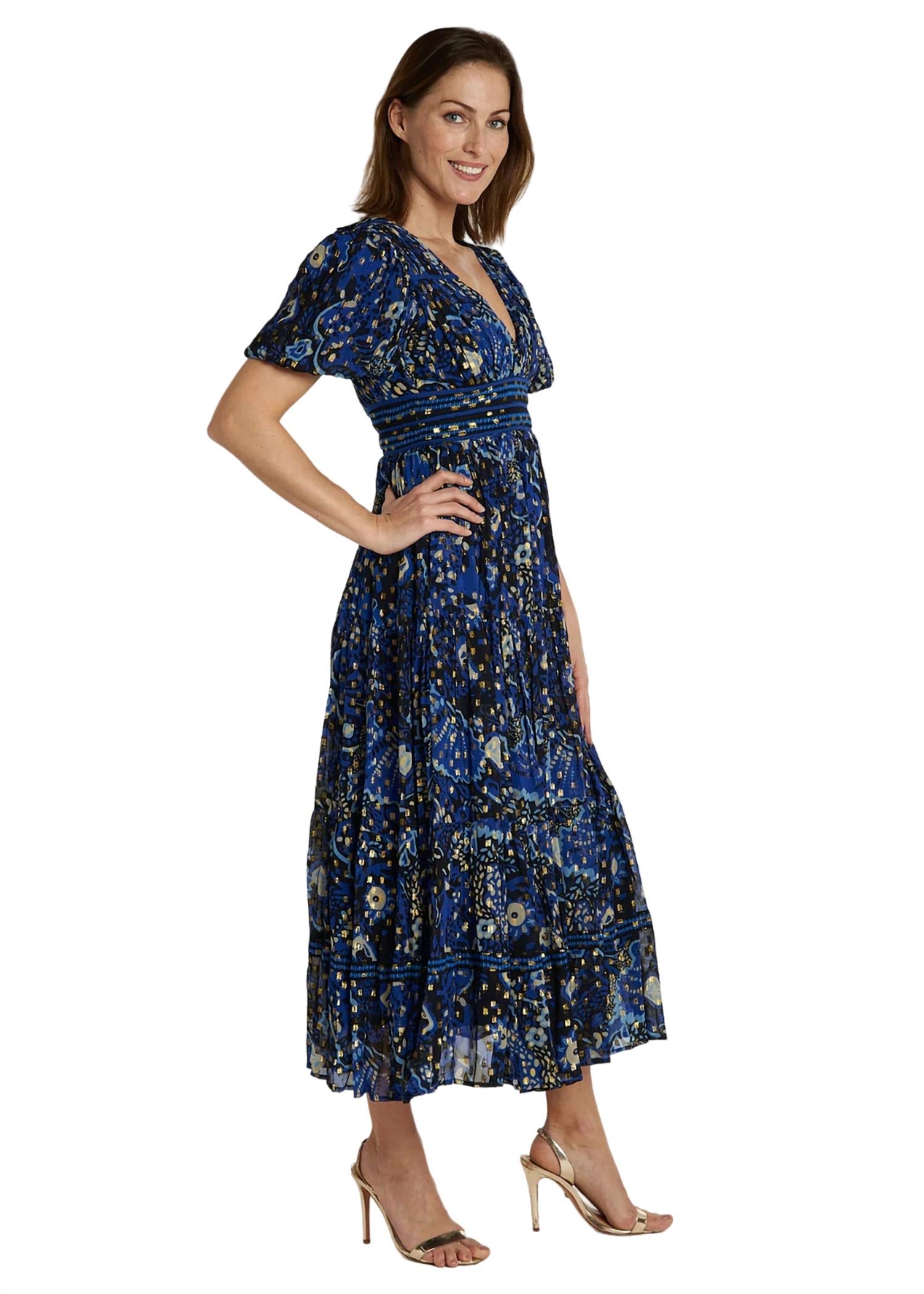 Puffed sleeves, a slight metallic shimmer and a flattering contrasting waistband. Has a pocket. 50% Viscose, 50% Lurex; Lining 100% Cotton. Made in India.