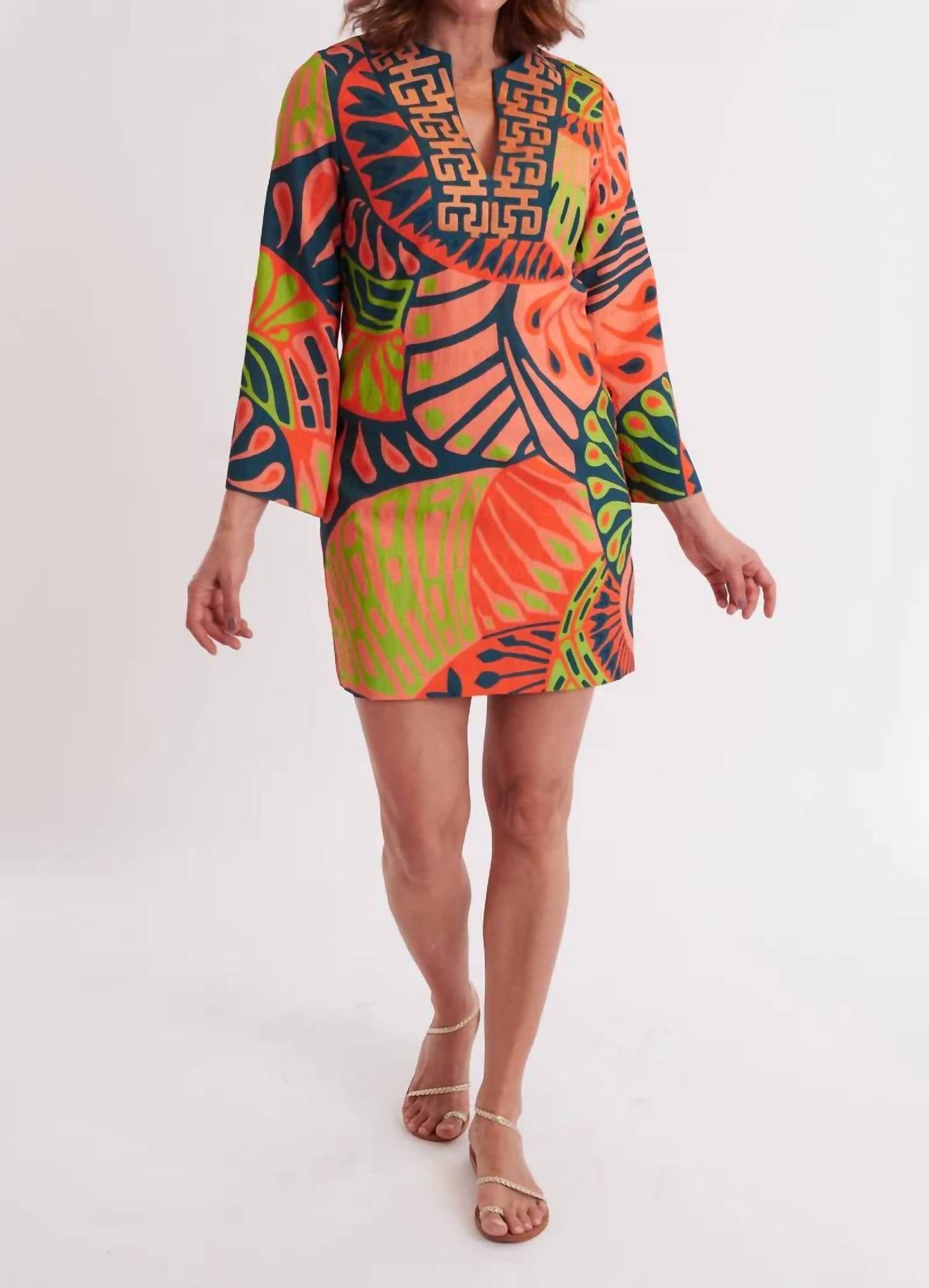 A short and breezy dress for those warmer days. The Minnie Mini in Paddle Pumpkin is a chic and playful choice with an embroidered trim neckline and flirty bell sleeves.