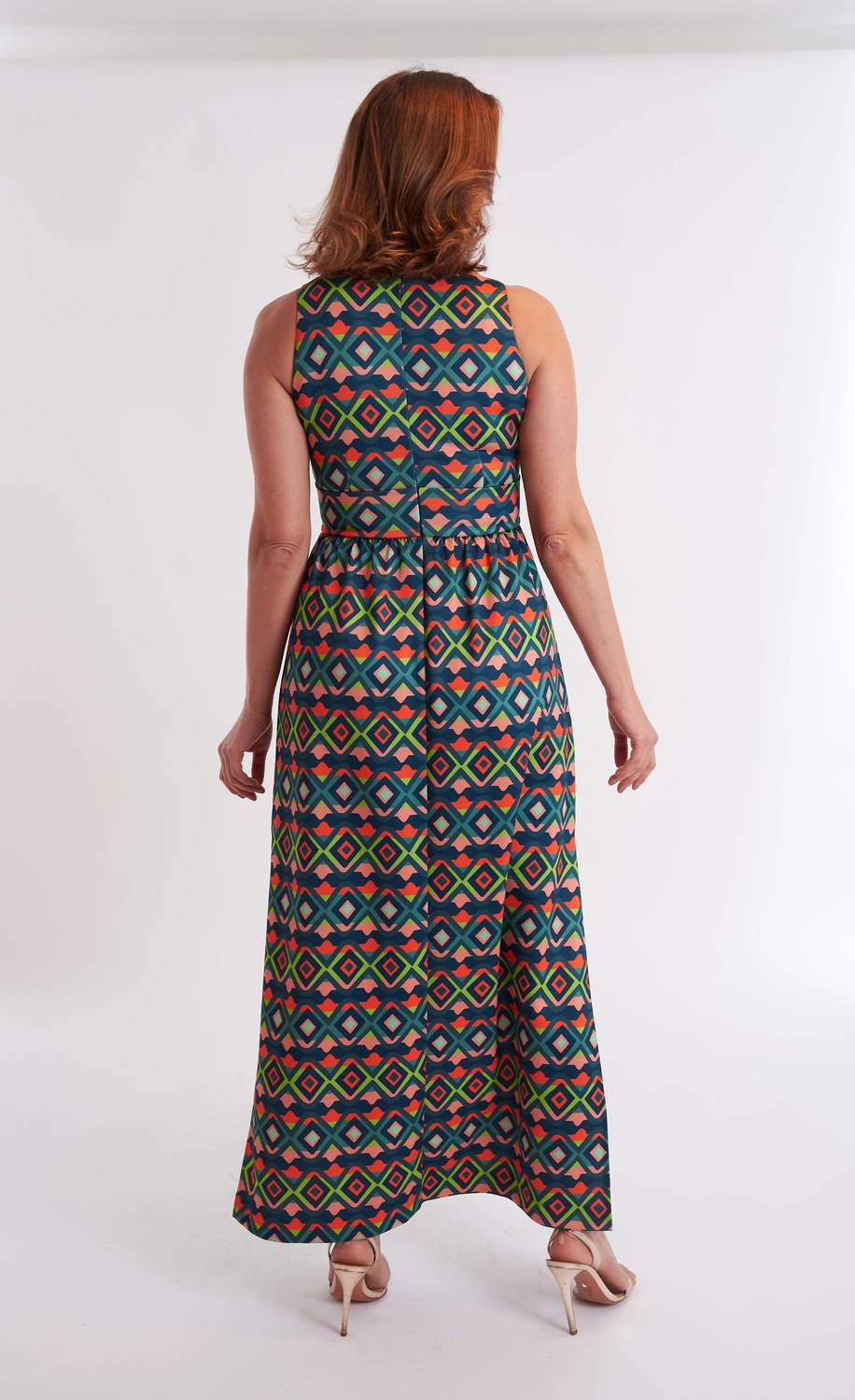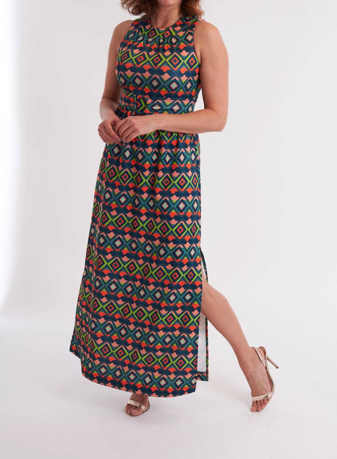 A maxi dress that is just as cute as it is comfortable. Introducing the Nina Maxi Dress by CK BRADLEY, an elegant sleeveless design perfect for your next vacation or spring event. Crafted with a geometric pattern in a stunning Diamonte Juniper hue, this slip silhouette features a classic crew neckline. The dress offers a sophisticated and graceful look with an effortless pull-on closure. Embrace the Boho Chic trend with this stylish piece.
