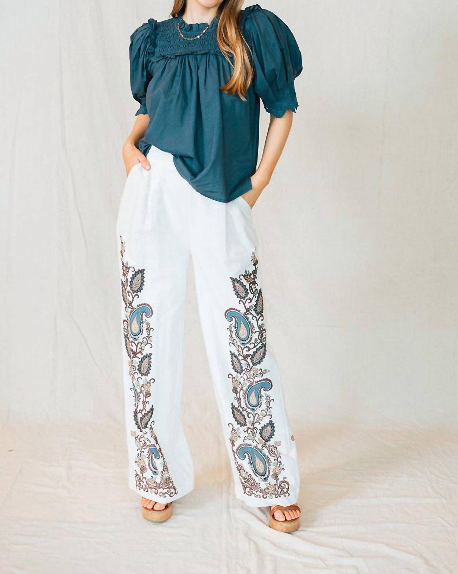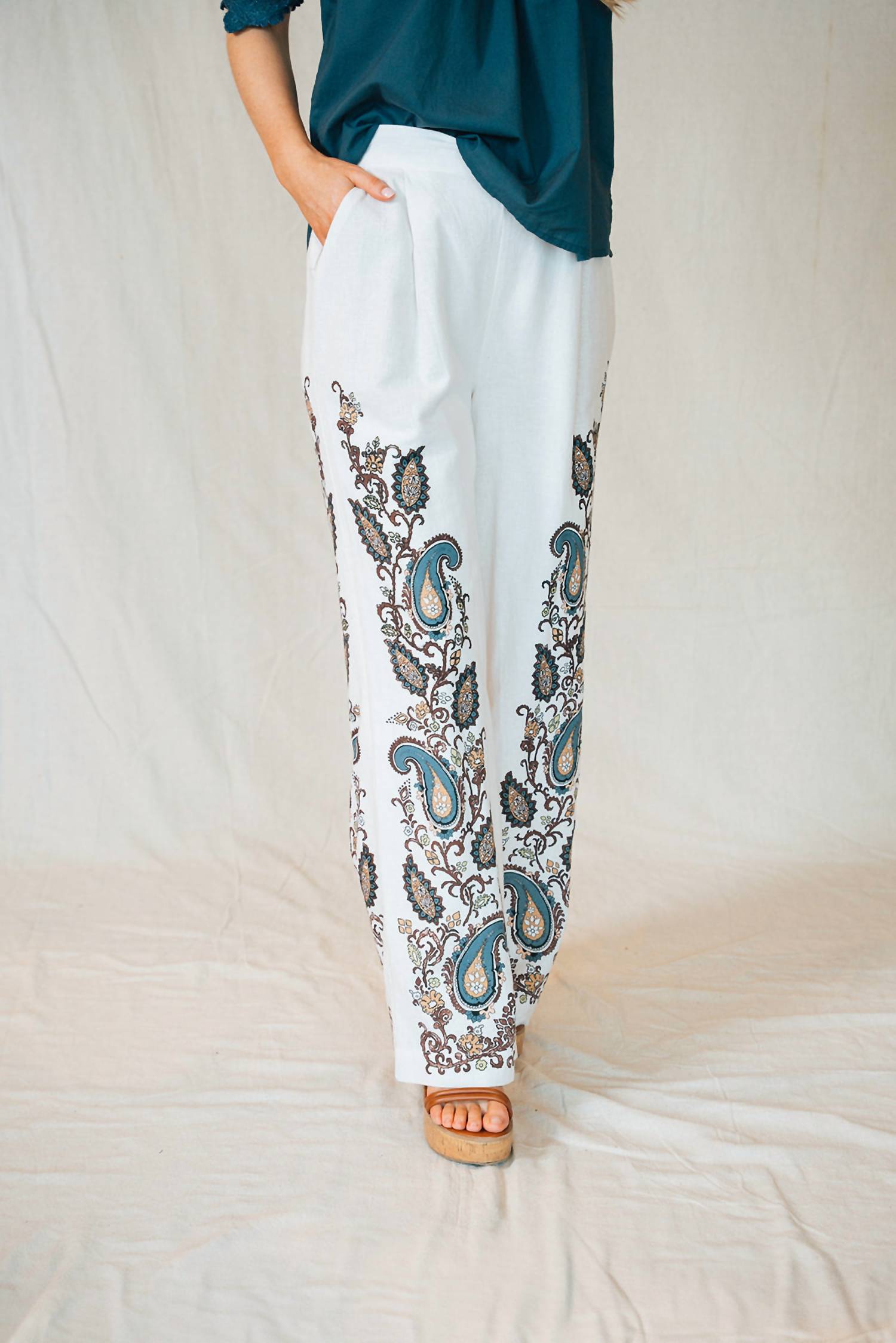 Experience effortless style with the Beau Wide Leg Pant by Cleobella, featuring a high-waisted, wide-leg fit that exudes boho sophistication. Crafted from a breathable linen blend of 70% linen and 30% cotton, these pants are perfect for any occasion with their elegant paisley embroidery and minimalist aesthetic. Closure: Side zipper. Care: Dry clean only. True to size, with an inseam of 29" for size XS. Delicate knife pleats and angled front pockets add practicality and charm.
