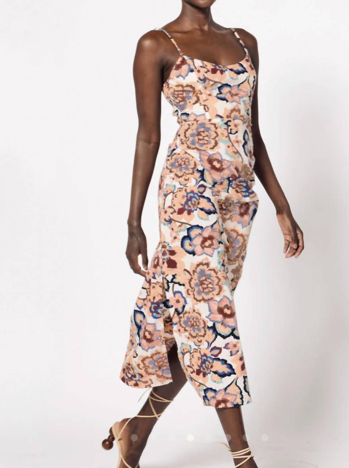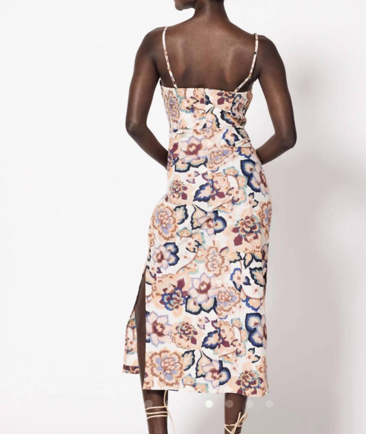 The perfect length dress does exist. Introducing the Geraldine Midi Dress by Cleobella, a statement piece designed for a summer vacation with a touch of maximalist flair. This white multi floral dress features spaghetti straps and a scoop neckline, perfect for warm days. Its bodycon silhouette is enhanced by a ruffle detail, under bust stitchline, and princess seams, with additional waterfall detail and bridal smocked back panels for added elegance. Originating in an undefined location, this dress offers a pull-on closure and a recommendation for hand washing to maintain its vibrant look.