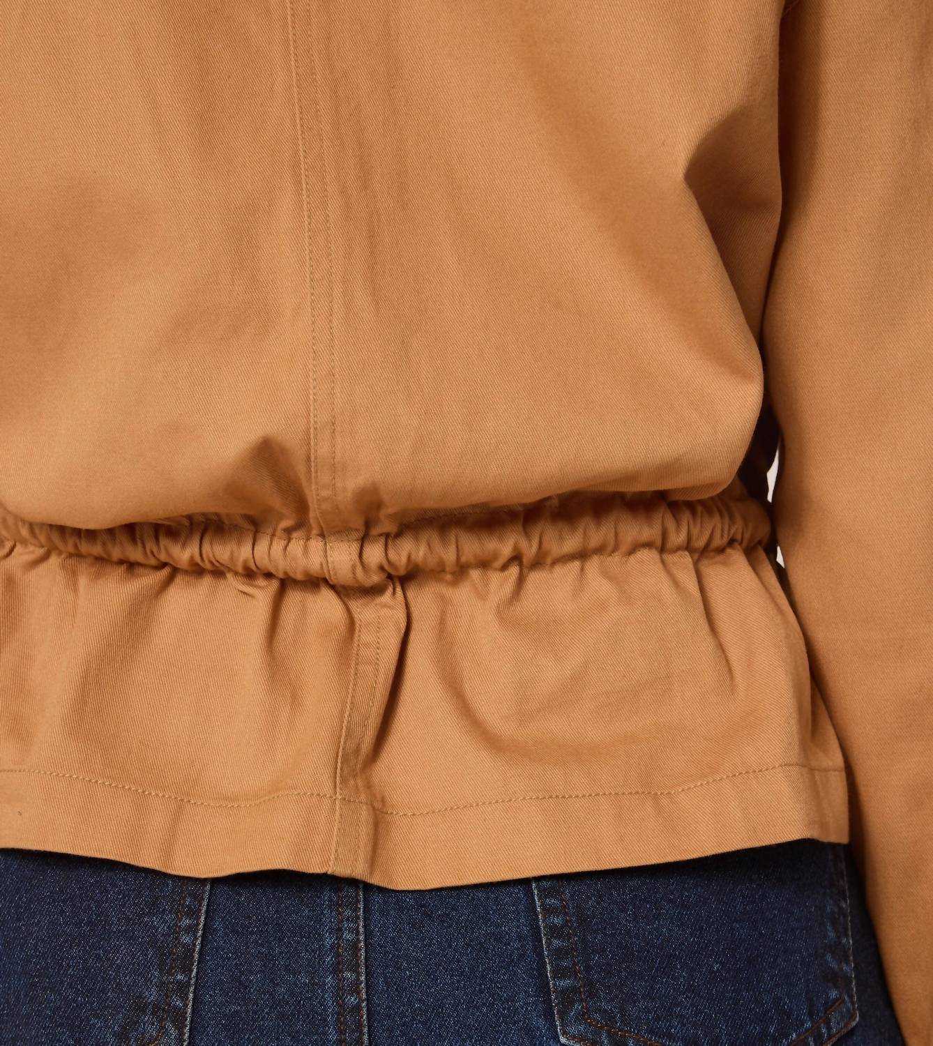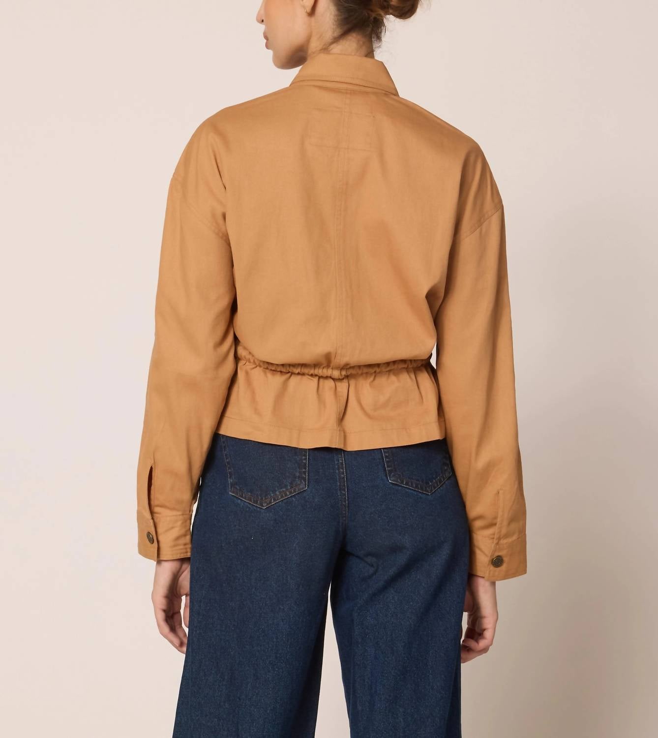 A jacket so versatile you can literally wear it with anything. The Jasper Jacket by Cleobella is crafted from durable cotton twill, ensuring it is made to last. This casual jacket in a biscuit hue features full-length sleeves and a zip front closure, offering both style and functionality. It is equipped with unique rope drawstring detailing at the waist for adjustability and two front pockets with button closures for added convenience. Made in India, this minimalist piece is perfect for fall and designed for women who appreciate solid patterns and practical elegance. Ana, with a height of 5'9.5", is wearing a size S.