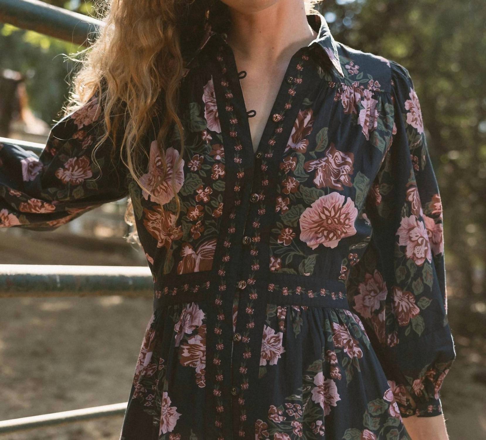 The perfect length dress does exist. Presenting the Gillian Midi Dress by Cleobella, adorned in a Juliet floral print that radiates boho-chic flair. This elegant piece features long sleeves and a button closure, embracing a refined A-line silhouette ideal for any occasion, especially baby showers and Thanksgiving. Crafted from 100% GOTS Certified Organic Cotton in India, it embodies a blend of classic femininity and modern sophistication. Care instructions include hand washing and laying flat to dry for enduring elegance.
