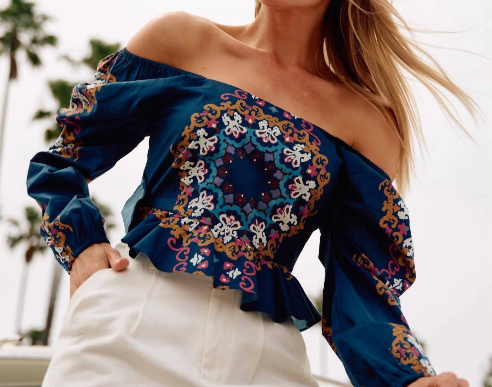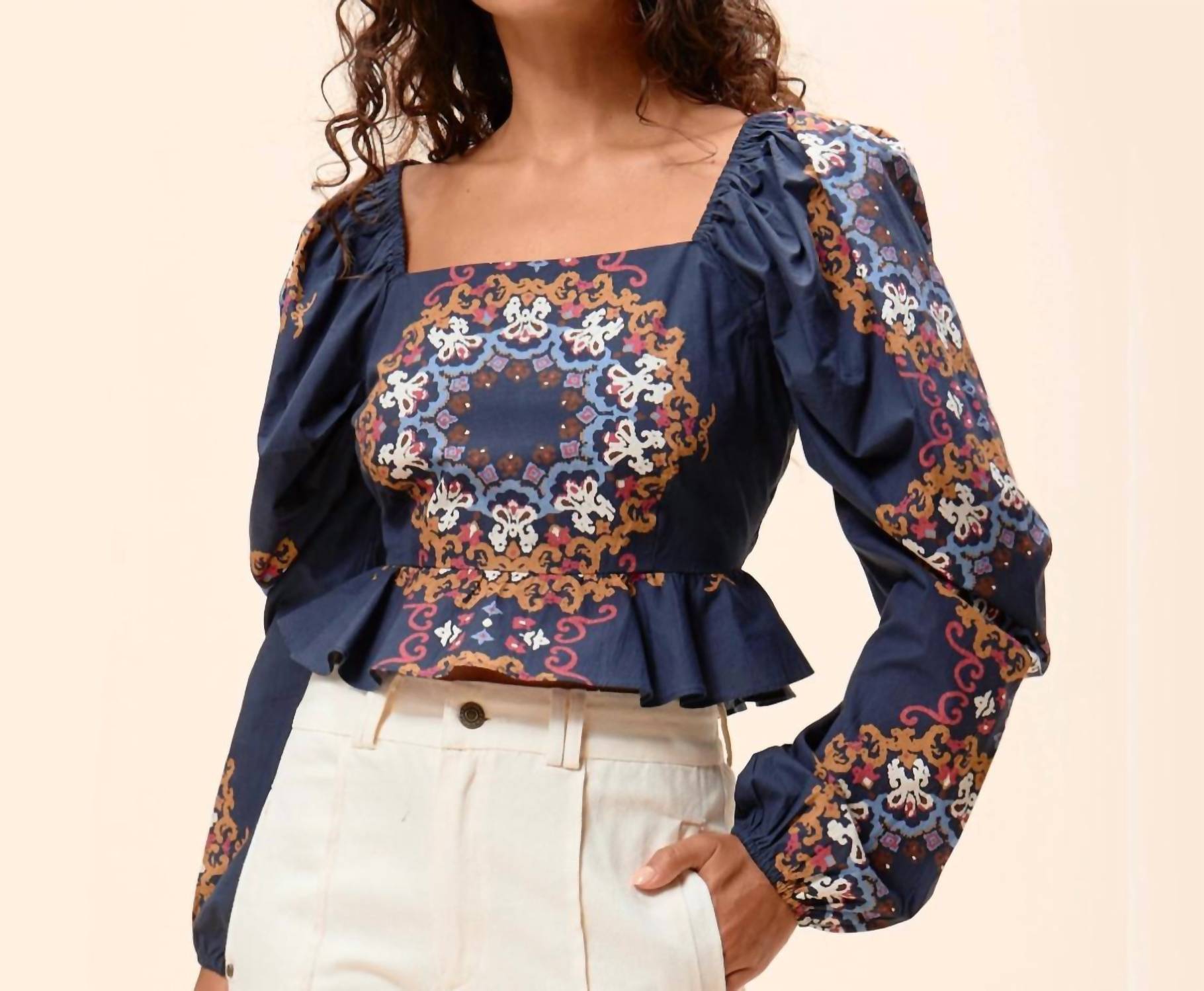 Pair this with your favorite jeans and slides for your next girls night out. Introducing the Women's Elizabeth Top by Cleobella, flawlessly crafted with long sleeves and a romantic leg o’ mutton design. Made from 100% GOTS-certified organic cotton, this piece showcases a flattering square neckline and elegant ruffle detailing at the hem. A hidden zipper closure ensures a perfect fit. This ethically handmade top from India is available in a stunning Venezia Blue, ideal for an effortlessly chic look.