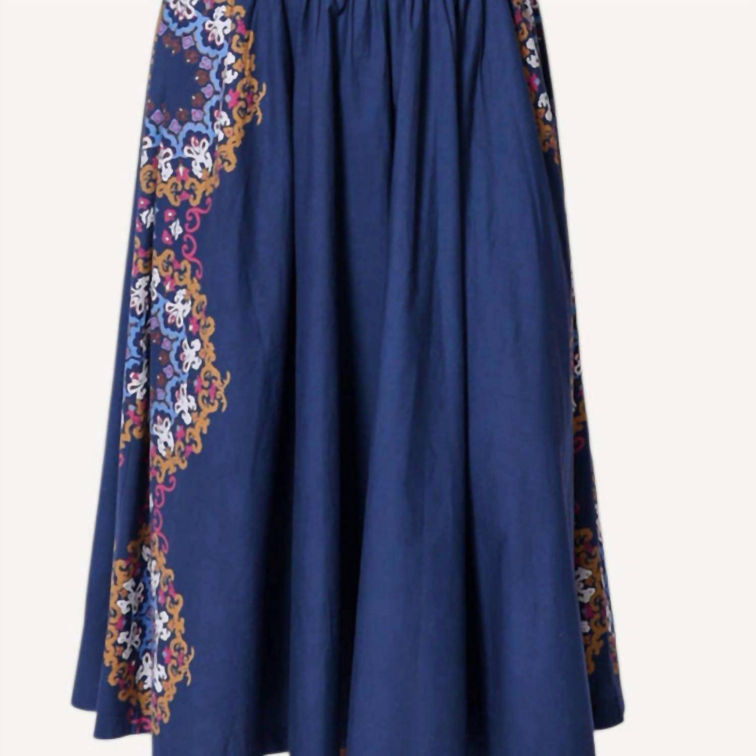 Tuck your favorite tee into this midi length skirt for an effortlessly cool look. Introducing the Esmeralda Ankle Skirt by Cleobella, a boho chic piece in captivating Venezia Blue, perfect for a spring vacation. This flowy, patterned ankle-length skirt is ethically handmade in India and crafted from 100% GOTS certified organic cotton poplin. The skirt features a quilting stitch detail at the front waist and an elastic back waist for added comfort. For care, hand wash and lay flat to dry. Model Ana is 5'9.5" and wearing size S, as is Nancy, who is 5'10".