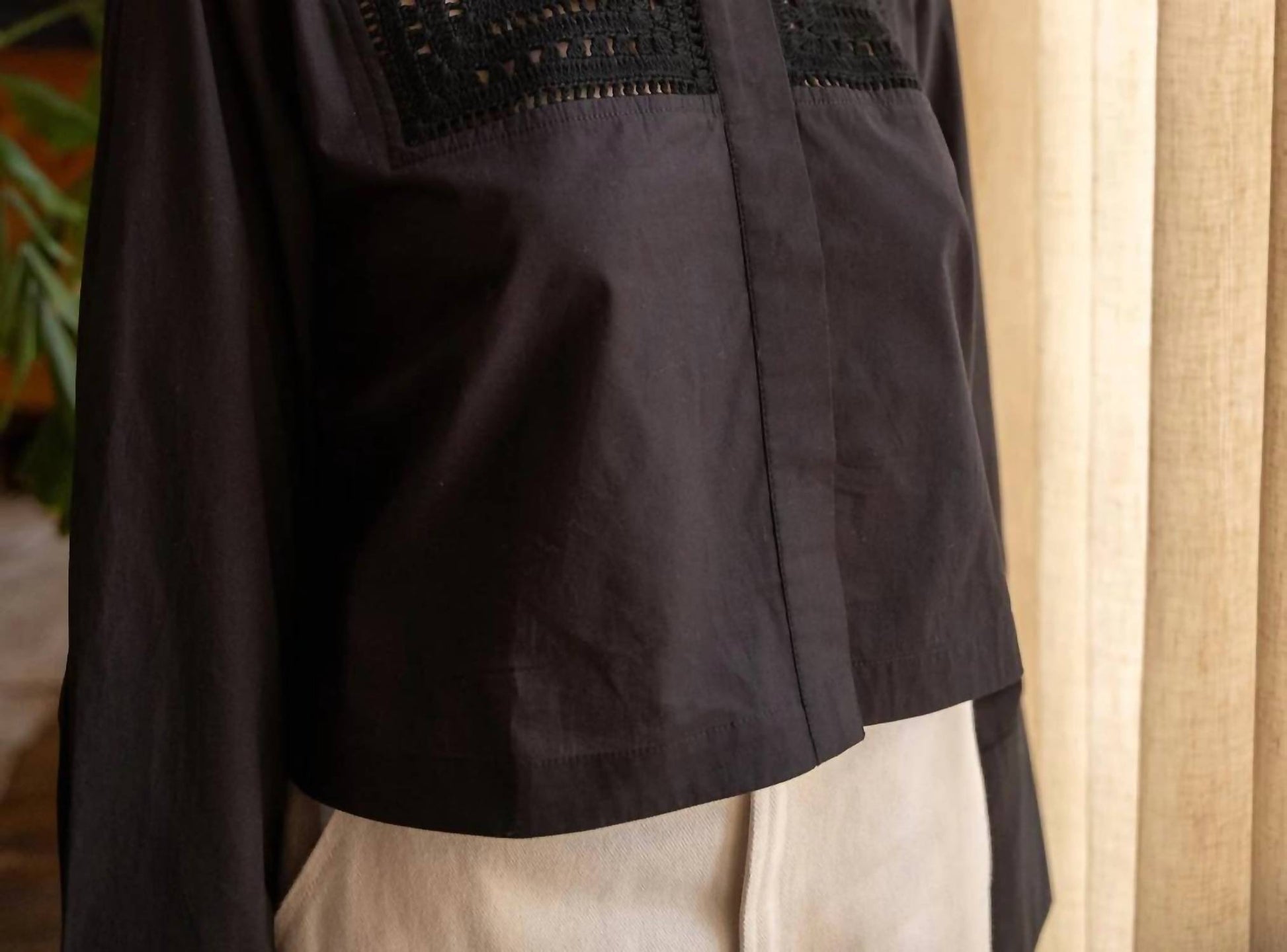 Pair this with your favorite jeans and slides for your next girls night out. Elevate your wardrobe with the Sierra Button Up Blouse by Cleobella, a chic black blouse perfect for any occasion. Crafted from 100% GOTS certified organic cotton poplin, this ethically handmade blouse features long sleeves and a classic collar. Made in India, it's a solid, bra-friendly design that ensures all-day comfort with a stylish button closure. Care instructions recommend hand washing and laying flat to dry for best results.