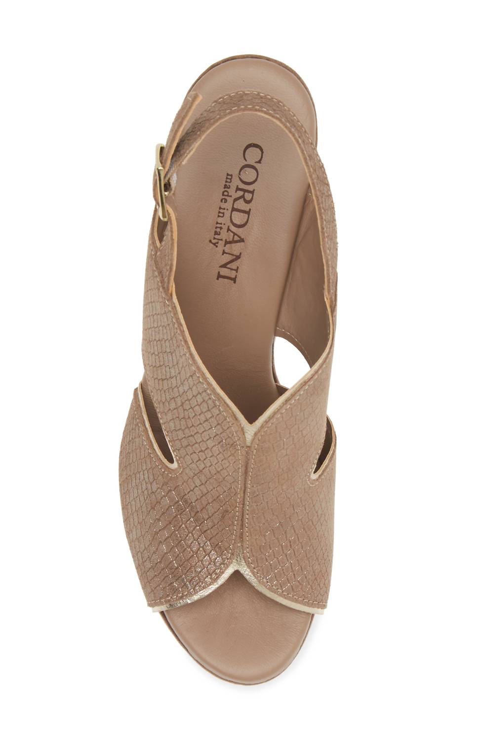 This sandal will take you from brunch to dinner and everything in between. Step into elevated style with the CORDANI Women Toni Slingback Sandal, a chic footwear choice in Fango Shimmer. These sandals feature a striking metallic block heel with a 4" height and a 1 1/4" raffia-wrapped platform for added flair. Made in Italy, these shoes boast a leather upper and lining, complemented by a rubber sole, and are designed with side cutouts and a supple suede finish. The cushioned insole ensures comfort in every step while the peep toe design adds a touch of elegance.