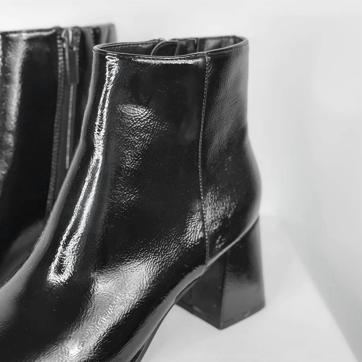 Say hello to the perfect, most versatile boot. The ankle height makes this style easily transition from day to night. Wear them with your favorite skinny jeans and tee for a more laid back look, or pair them with your favorite mini dress and jacket for a night out on the town. Step out with confidence in the Women's Felicia Bootie by Corkys Footwear, a chic addition for any holiday party ensemble. Featuring a synthetic black patent upper, these booties come with a stylish square toe and a comfortable 2 1/2" block heel, perfect for the New Year's Eve season. The design is enhanced with a practical side zipper for easy wear. These shoes run small, so consider sizing up for half sizes.