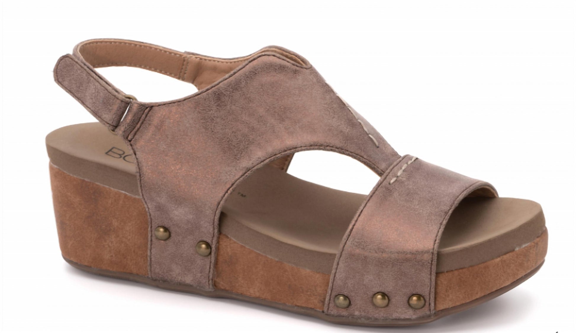 This sandal will take you from brunch to dinner and everything in between. Elevate your summer style with the Women's Refreshing Wedge Sandals by Corkys Footwear, crafted in chic bronze. Made from faux leather, these sandals are perfect for holiday parties with their minimalist and trendy design. The wedge heel style offers a low heel height of 2 inches, providing both comfort and elegance. Ideal for Thanksgiving festivities, these sandals are a must-have for any fashion-forward wardrobe.