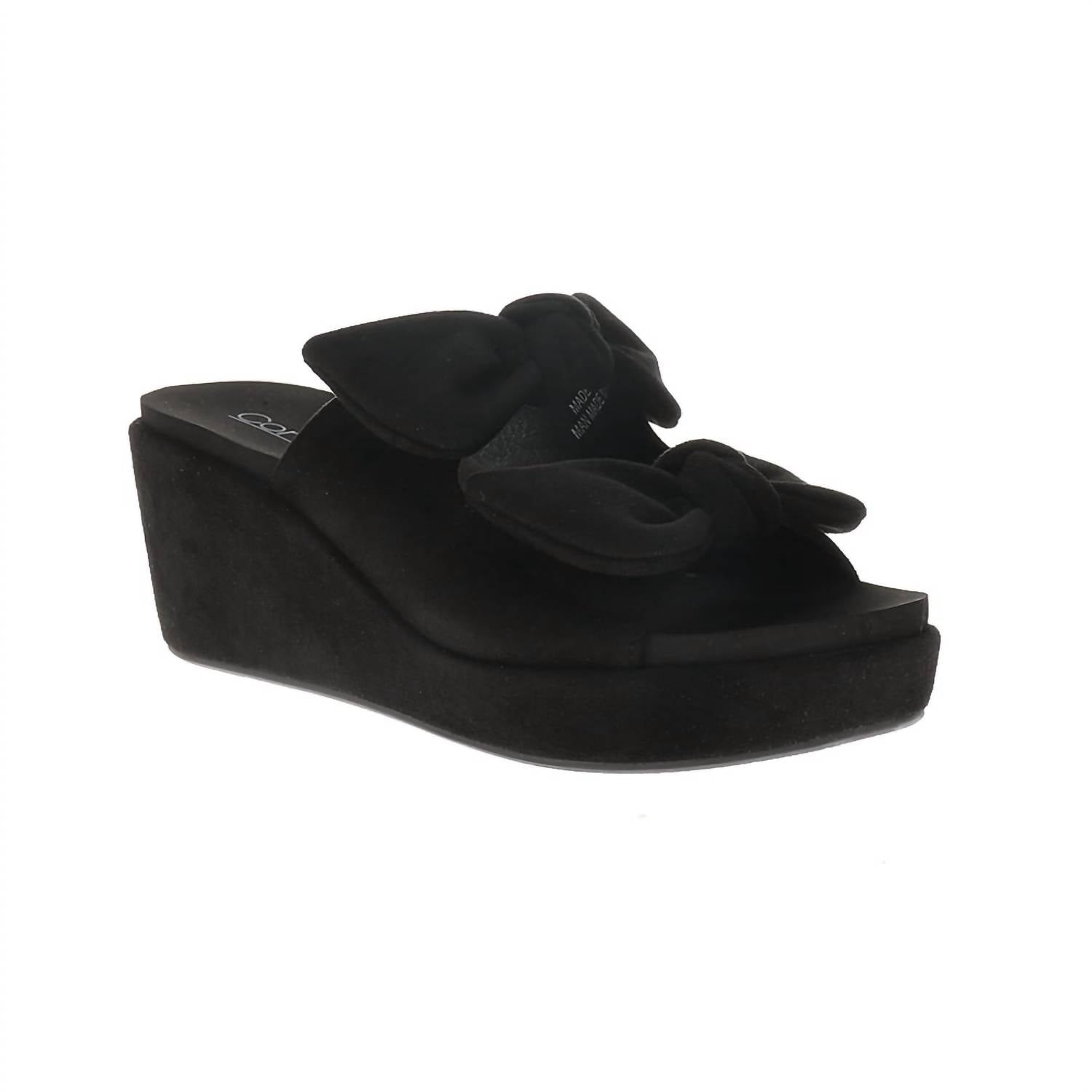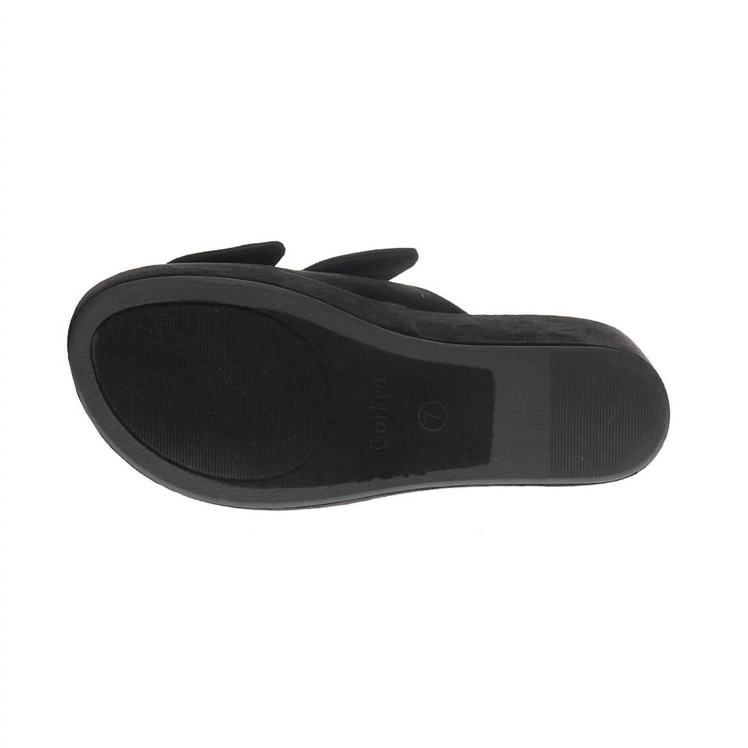 Timeless wedges that will be relevant season after season. Meet the Women's Bowed Up Wedge Sandal by Corkys Footwear, a chic addition to any springtime wardrobe. The soft black faux suede upper is elegantly adorned with bow details, while the slide-on design ensures easy wear. With a cushioned footbed for all-day comfort, these wedges offer a lightweight 3" wedge heel and a 1.25" platform for stable lift. Perfect for a New Year's Eve celebration or any holiday party, these sandals run true to size, suggesting you size up if between sizes.