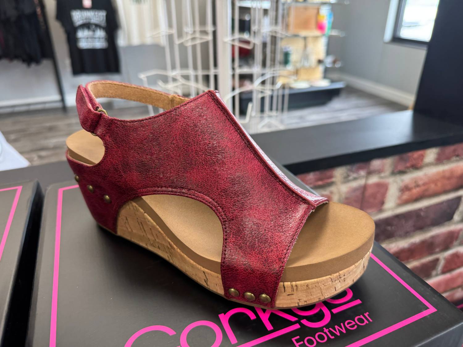 Dresses, denim, shorts... these wedges go with just about anything. Step into summer with Corkys Footwear's Women's Distressed Sandal, a bold red statement piece perfect for boho chic, vacation-ready style. These wedges feature a high wedge heel, enhanced with stud embellishments on the sides and an open toe for a breezy look. The renowned padded footbed promises comfort without compromising on style. Ideal for making a statement this summer.