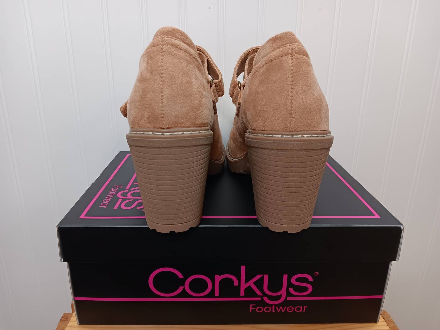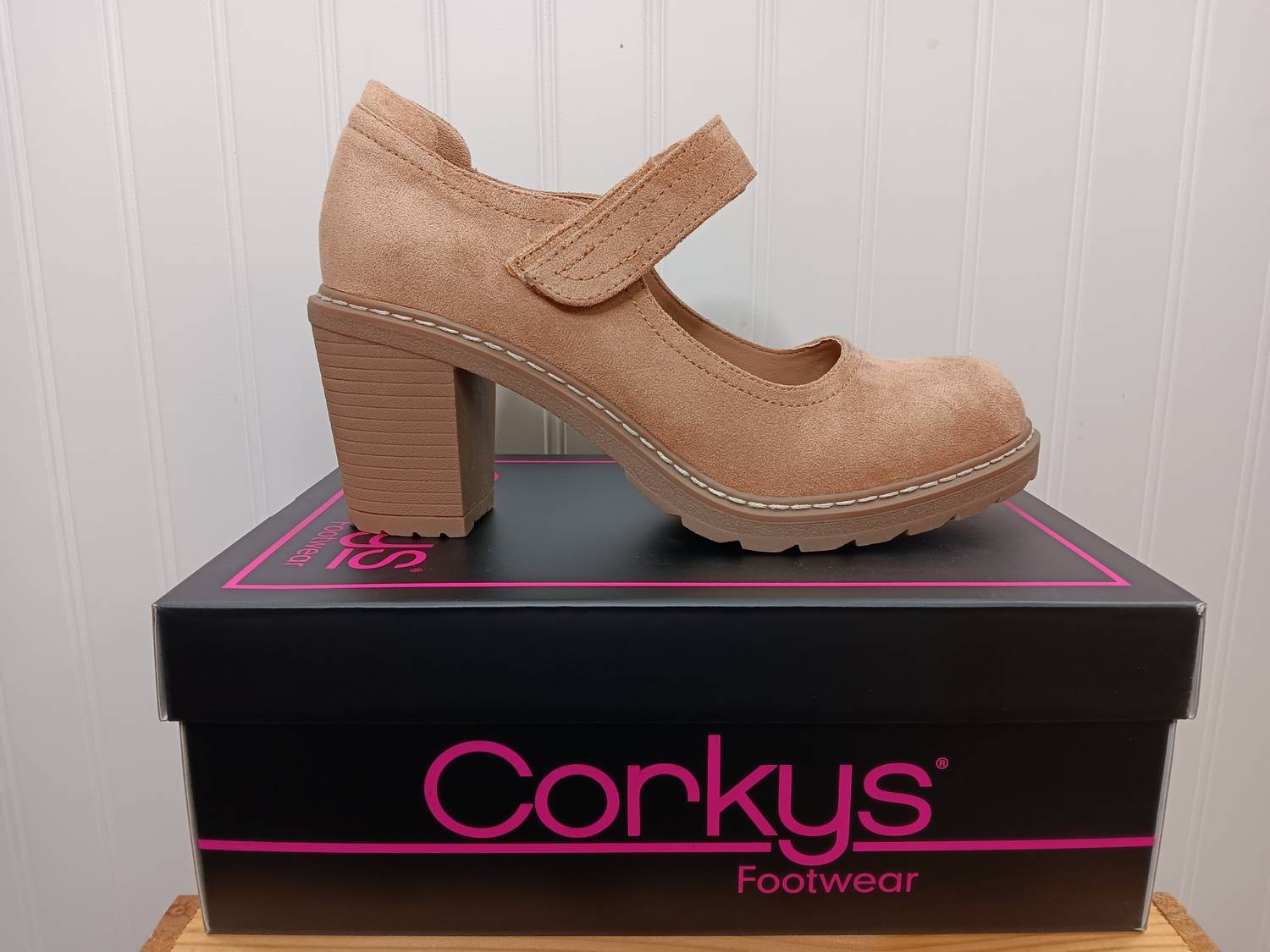 Pair these beauties with your favorite skinny jeans or dress for a night out on the town. Experience the perfect blend of comfort and style with the Women's Mary Go Round Suede Heels by Corkys Footwear. These camel-colored heels feature a round toe and a chic platform heel, making them ideal for both workwear and special occasions like Thanksgiving or an anniversary. Made from premium suede, they provide soft insoles and adjustable Velcro straps for a custom fit. With a mid heel height of 2 1/4"-3", these heels are perfect for spring fashion and beyond.