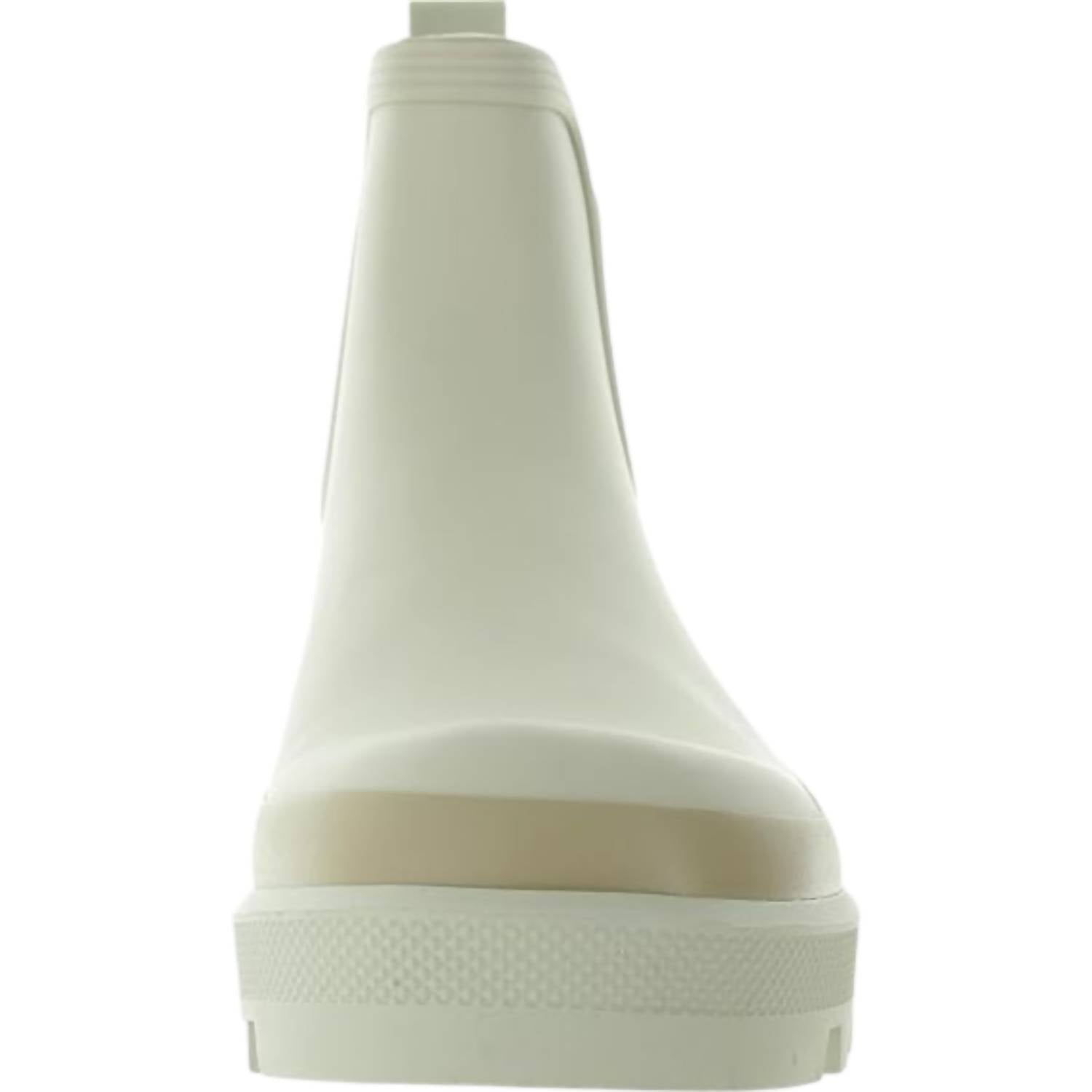 Rainboots so cute, you'll want to wear these even on the lightest drizzle days. Step out in style. Designed to keep you dry and comfortable. Made in Canada. Feature a lightweight anti-slip rubber sole and a rubber outer material, making them perfect for wet conditions. With an ankle shaft height and pull-on closure. Provide ease and convenience. Removable EVA footbed and knit lining ensure comfort. Enhanced with a round toe and platform heel with a low height.