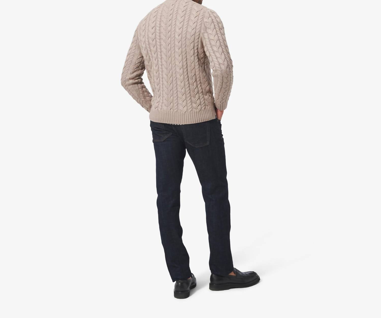 Made from sustainable materials. Custom cable knitting with twist, braid, and link stitch. 1x1 rib crewneck. 1x1 rib at cuff and hem linking at armhole seam. M+M logo label at waistband.