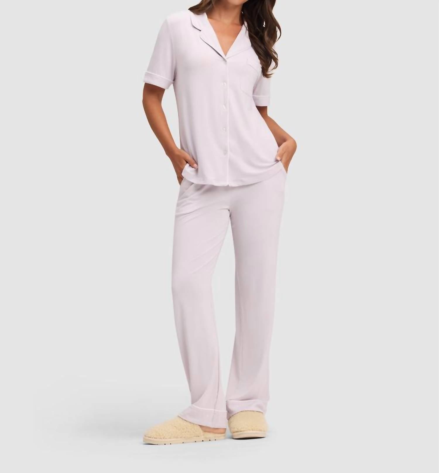 A perfectly tailored straight leg that you'll want in every color! Slip into the Bamboo Stretch-Knit Pajama Pant by Cozy Earth, a lilac treasure designed for ultimate relaxation. Made in a composition of 95% Viscose from Bamboo and 5% Spandex, this solid-colored, straight-leg pant offers a regular fit with pull-on closure. It features side pockets and contrast piping details, perfectly combining comfort and style for a minimalist look ideal for spring vacations or Hanukkah celebrations. For care, machine wash and tumble dry for easy maintenance.