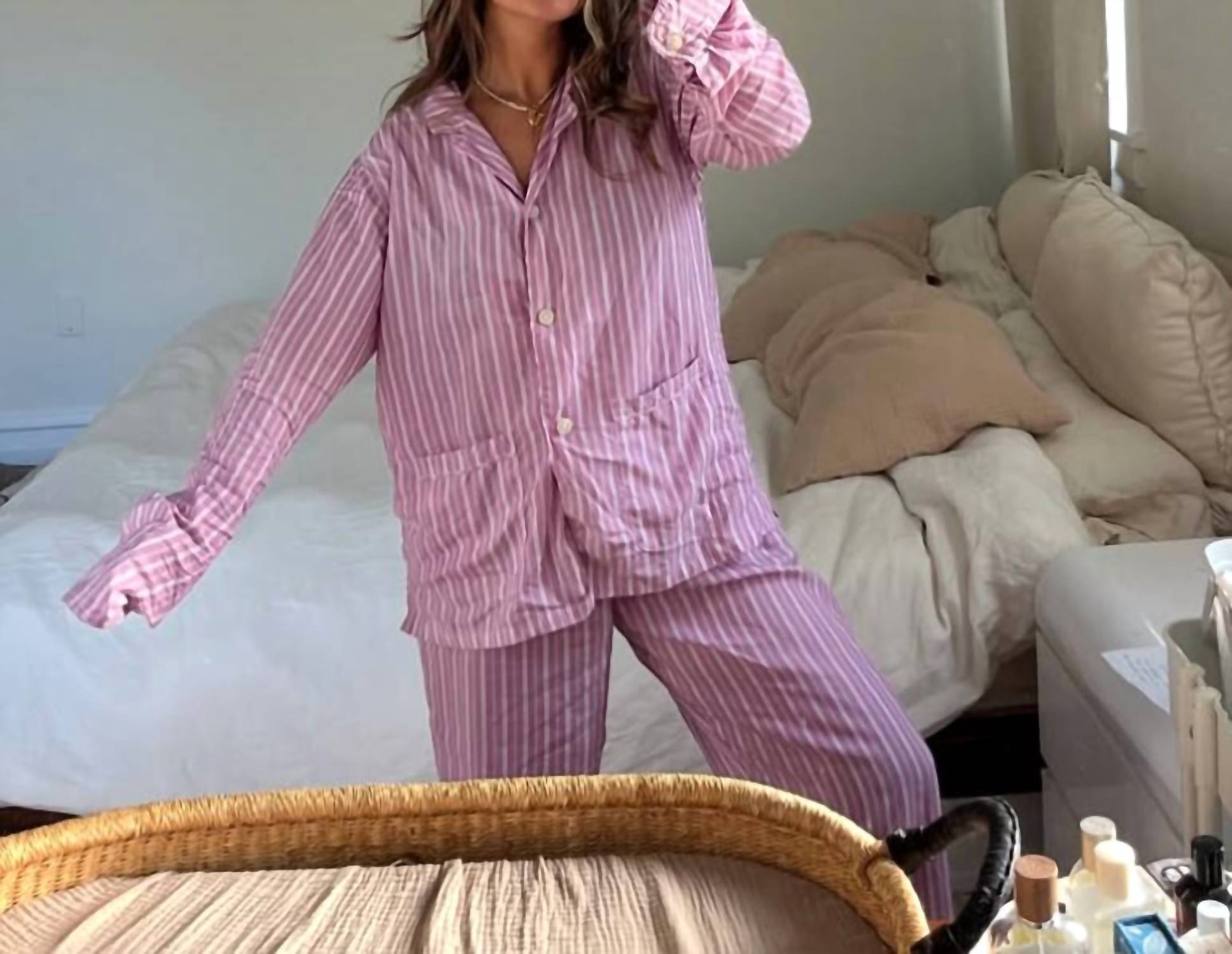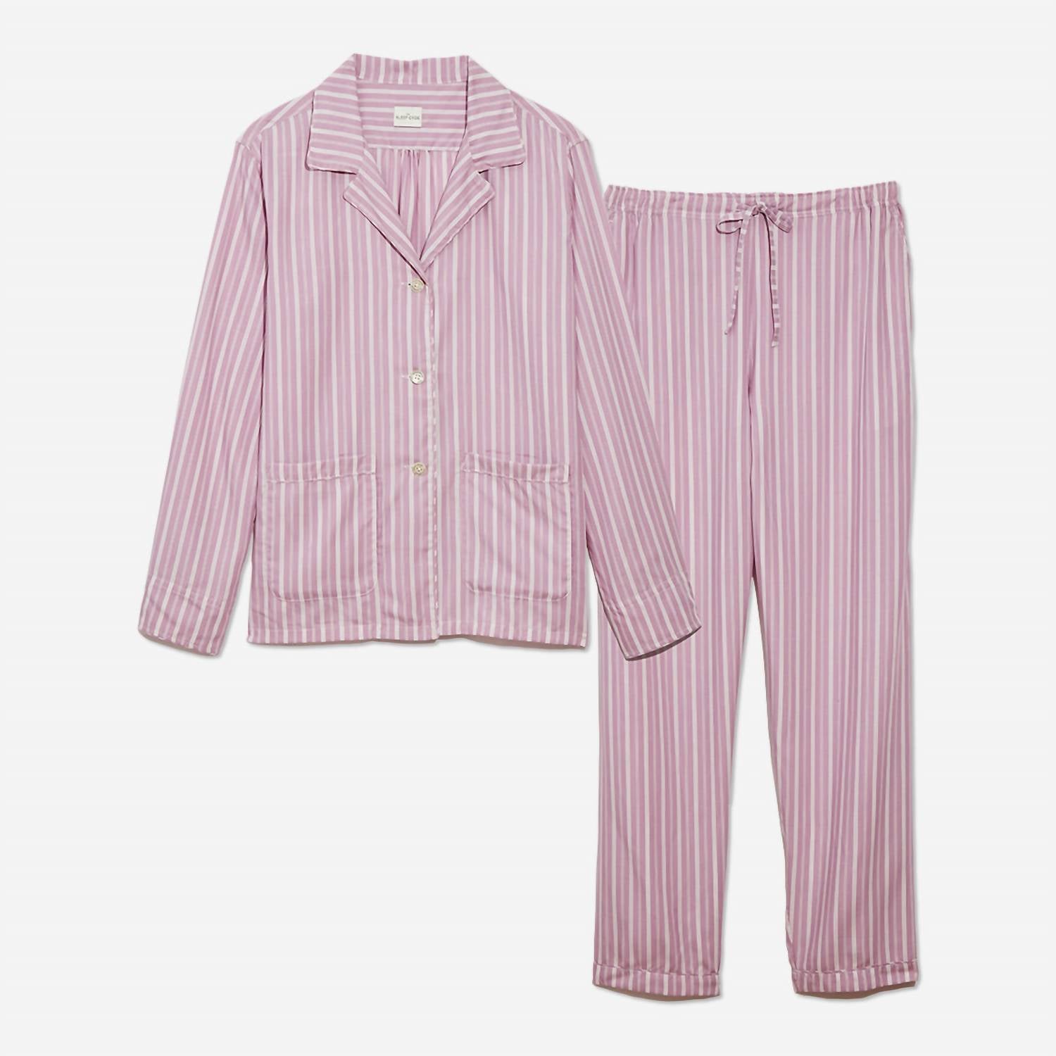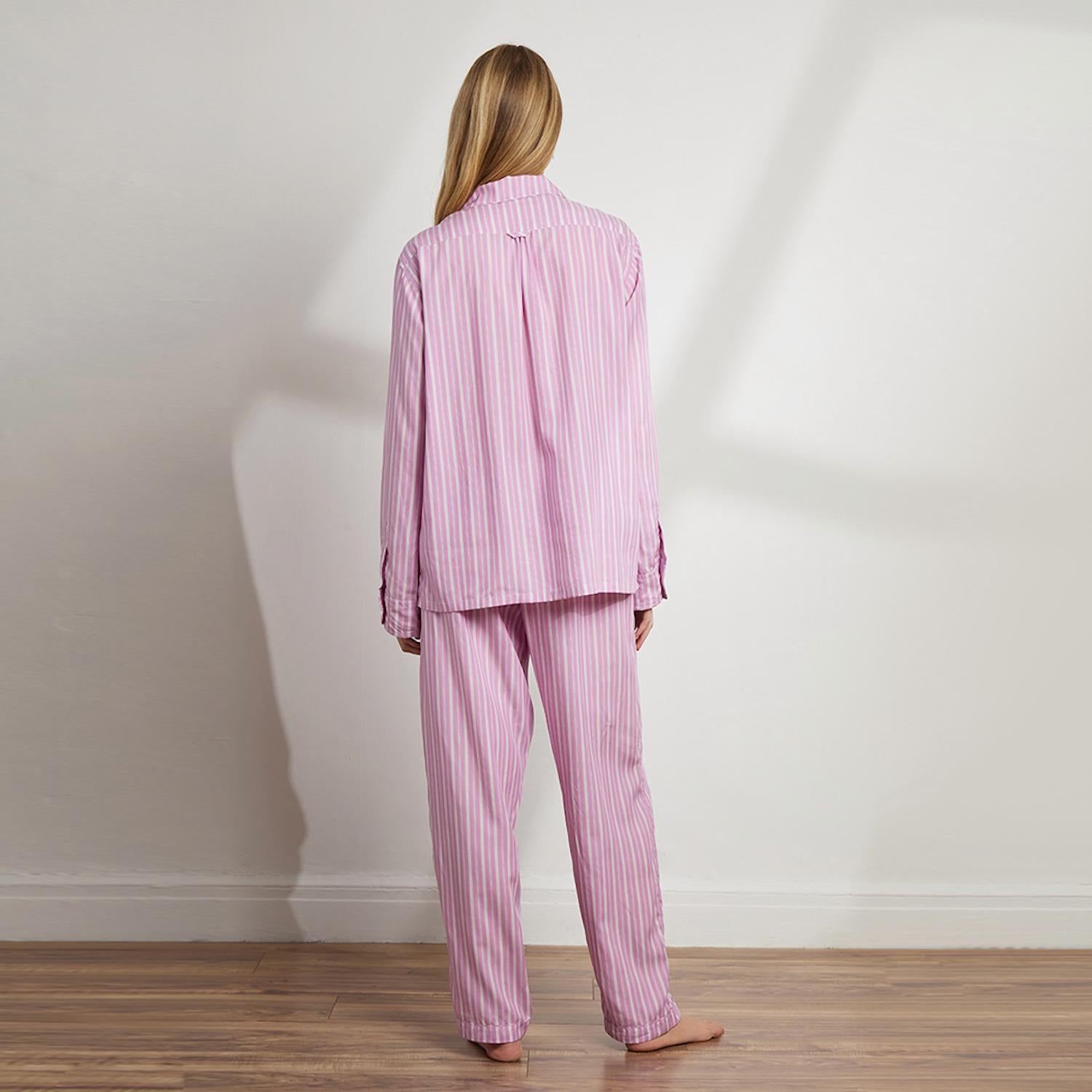 The perfect piece to lounge in, sleep in, and cook breakfast in. Experience luxurious comfort with The Sleep Code Women's Striped Soft Pajama set in elegant lilac. These pajamas feature a long sleeve, button-up top with two patch pockets and functional button cuffs, perfectly combining classic menswear elements with a feminine flair. Crafted from sustainable TENCELâ„¢, they offer a silky smooth touch, known for its breathability and moisture-wicking properties to keep you cool through the night. Incorporating a matching pair of bottoms with an elastic waistband and drawstring, they ensure a custom fit for ultimate relaxation.