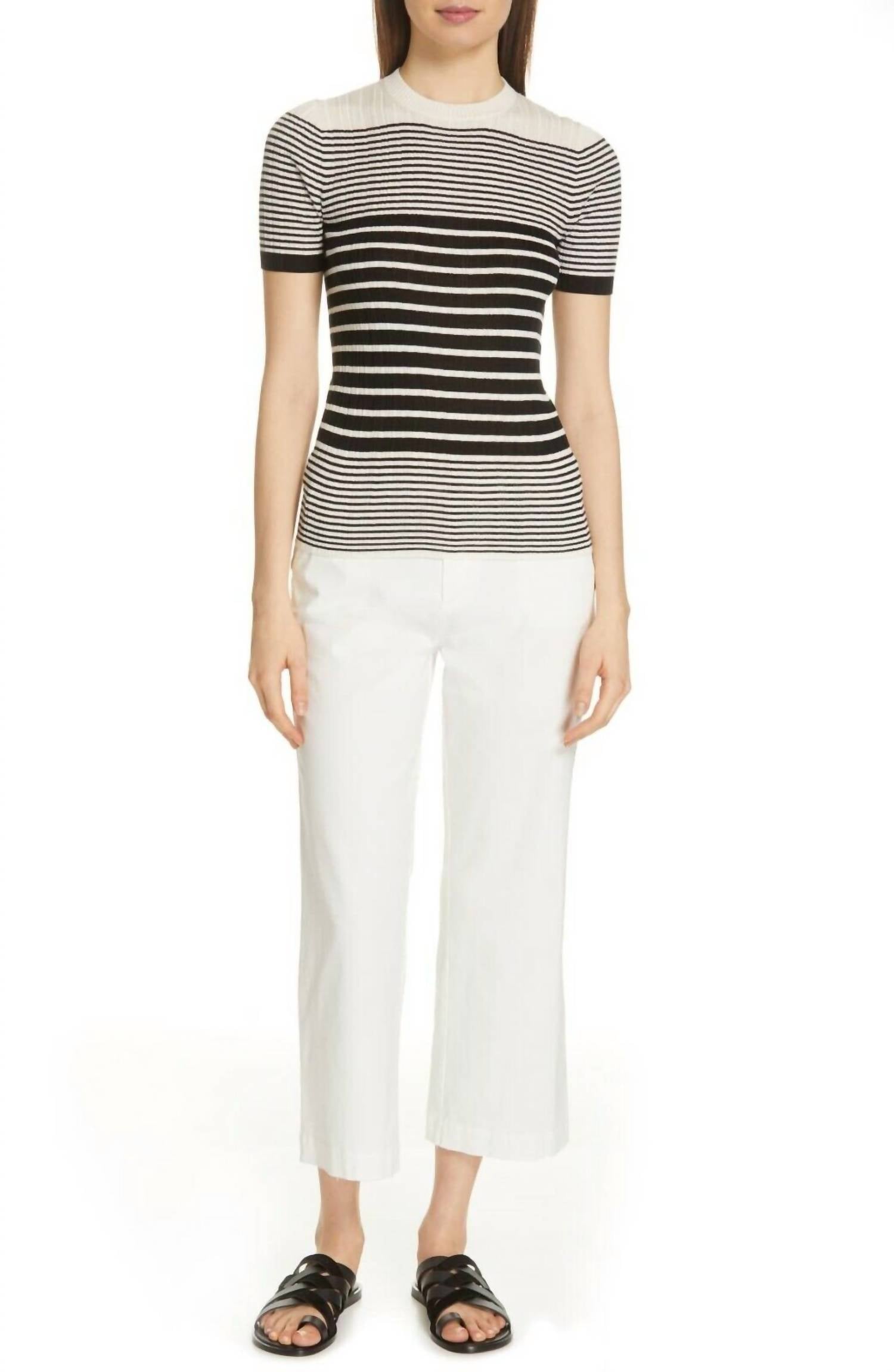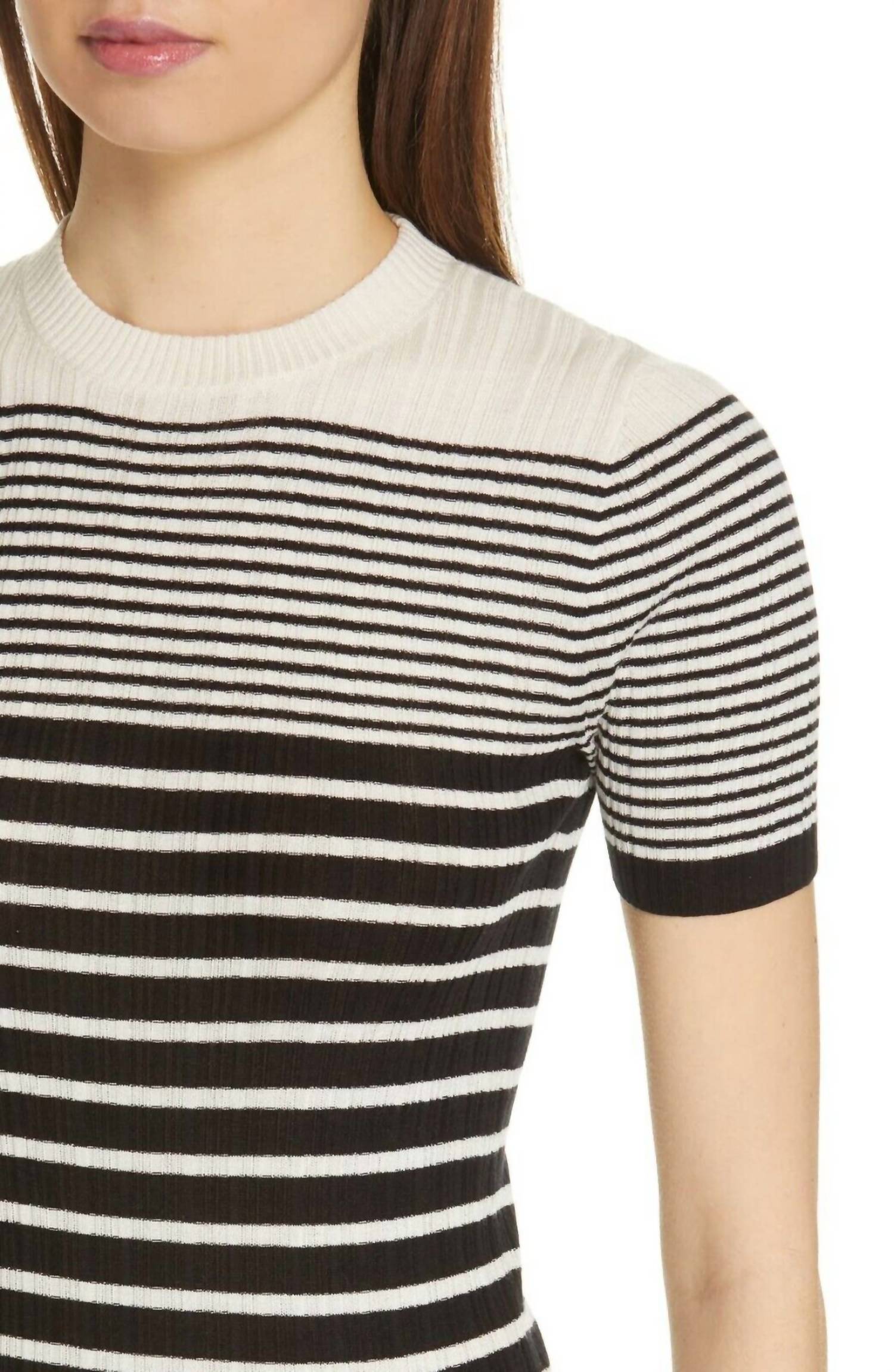 Elevate your wardrobe with the Striped Short Sleeve Silk Cashmere Knit Sweater by ATM, a perfect blend of luxury and style. This sweater, crafted from 85% silk and 15% cashmere, features a flattering rib stitch and graphic stripes that accentuate the waist. It measures 25" in length with a 15" shoulder, 17" chest, and 10" sleeve, offering a true-to-size fit. Designed with a classic crewneck, this multicolor piece is finished with a convenient pull-on closure and should be dry cleaned for care.